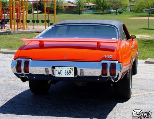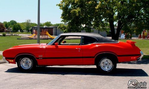 one of the straightest cars around with a 10,000 paint job, restored in 2008 lots of money invested into this sweet car, has numbers matching drive train car is painted with BASF Base Coat Clear Coat in factory color Rally Red paint , Has 442 w30 emblems,442 hood ,trunk, rear spoiler and rear bumper along with factory trumpets and aluminized 2.5 inch exhaust with flow masters and coated headers, correct black stripes buried in the clear, new brakes all around, tinted windows, nice stereo system, complete front end rebuilt along with rear springs and shocks , and new tires and wheels , aluminum intake and holley Carb HEI dist ,ect interior is as nice as the out side, runs and drives like a new car looks great can take to all car shows. this is a very detailed cutlass with the added 442 w/30 options and at a great price and the list goes on and on , if interested reply with question or your phone number and I will call you back right away , don't need to sell so no low ballers , this is a very straight Cutlass with all the options of a 442 for a lot less and with a high end paint job.. and has clean floors and trunk with no issues must see in person .pictures do not do justice to this car , I am available to show or you can send an inspector out, I will also help load for shipping once you have a carrier . no disappointments
