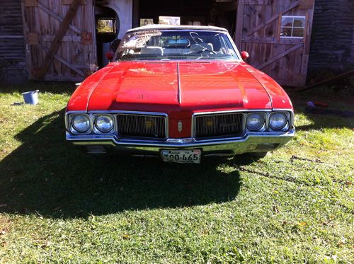 Up for auction is a 1970 Oldsmobile Cutlass SX Convertible barn find. Car has 73,500 miles on it and is all original, never pulled apart. Drive-train is the original matching number L31 455 (block #30E179556) with E heads. Car is loaded with options: power windows, power door locks, cruise control, dual sport mirrors, dual exhaust, factory Hurst (slap-stick) shifter, 12 bolt rear end, exhaust cut out rear bumper with dealer installed tow hitch (These tow hitches were installed on SX's by dealers to appease congress because of new muscle car insurance regulations in the 70's.) and correct rally wheels. Dashboard is in good shape and not cut. No cracks in dash pad and has original radio. Only 7,197 SX's were produced in 1970, and out of that, 793 were convertibles. I have the build sheet to prove authenticity along with past registrations, the protect-o-plate, dealer pre-delivery check sheet, claim check number, accessory brochure, consumer information pamphlet, and SX 455 Club registration. Car needs full restoration. Doors, rockers, hood, deck lid, and trunk floor are all decent. Frame is solid. Floors and quarters will need the usual work. Engine appears to be stuck from sitting. This is a real deal car with the paperwork to back it up. Well worth restoring. If you are a true Oldsmobile enthusiast don't miss out on this rare piece. Please call with any questions. #603-332-9698