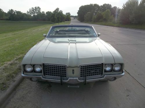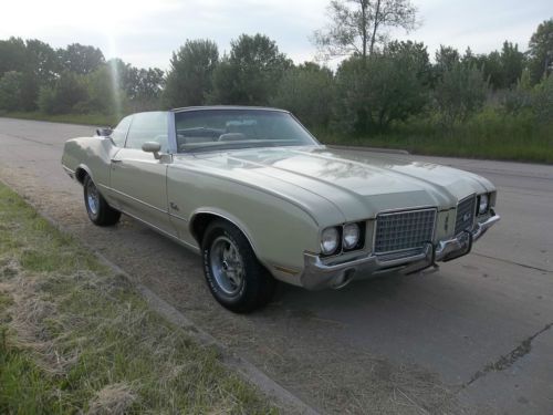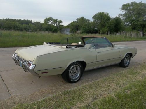 1972 Oldsmobile Cutlass Supreme Convertible This Oldsmobile up for auction is the perfect classic droptop to enjoy a full summer of top down cruising! This was the final year of the Cutlass/442 convertible!! There are not very many complete original convertible's left in existence. This 1972 Cutlass Supreme Convertible would be a very nice example to make into a 442! I've had many Cutlass Supreme's that I transformed into 442's, and many real 1972 442 models. These 70's muscle cars have incredible investment potential, and have been referred to as rolling bank accounts. Remember, When the top goes down, the price goes up! This Classic Cutty can easily be enjoyed as a daily driver in its current condition. I made this purchase several years ago from a very nice older gentleman in his 80's. He lives in an upscale suburb west of Chicago. This elegant looking convertible was retired to his double door garage attached to his palatial estate for over 20 years. The full size front garage door opens to the driveway, and the full size rear garage door opens to the backyard. This way he was able to enjoy looking at it from his sculptured back yard without the possibility of anyone seeing what was stashed in his garage. According to him he was the second owner, and this antique only had one re-paint years before he stopped driving it simply because of a leaking fuel line. The damaged line was replaced, and all the fluids were changed, and then this Rocket fired right up with some starting fluid. Even after all those years this engine sounds like a champion. There were some household items placed on the hood and the trunk over the years, so there were some marks on the paint. I was able to have the correct original code 50 paint mixed up at the local Bumper to Bumper, and I did touch up the entire car by hand. He said this Olds does have the original numbers matching Rocket engine. I double checked to make sure. He was telling the truth! I personally saw the last six digits 106053 from the vehicle identification number on the block. This is absolutely the original numbers matching block that was recently detailed. I know in this day and age that having the original engine definitely makes these older classics much more valuable, so for you numbers guys out there, this one is the real deal. It would be very hard to find any car with all the original little components still intact. This engine still has the engine block breather still present and accounted for. Usually those were long gone in the first few years after these cars were purchased new. If you scrutinize the engine pictures you will see what I mean. I didn't even see any of the hose or wire clips missing. I know they make aftermarket replacements, but nothing beats the originals. The original control arm covers are still attached to the inner front fender wells. When I scroll through all of the other Cutlass models online it is very rare to see a car that is not missing a number of little items. I always try to pay attention to all the little details, so the new owner gets a complete car. I saw no leaks on the ground whenever this Cutlass is parked. I checked the casting numbers on the engine, and they are 39558, so this is the only block used for the Oldsmobile Rocket 350 engine in 1972. Only 1,025 of these Cutlass Supreme/442 convertible's were made with an automatic transmission in 1972 making this Cutlass Supreme a very rare and highly sought after model. This 1972 Oldsmobile Cutlass Supreme/442 convertible is a very unique car to own. Since this model was factory ordered as a Cutlass Supreme it is still considered to be like a real 442 if it is converted properly. I'll give a little background on the 1972 Oldsmobile Cutlass Supreme, Cutlass S, and 442 models. Prior to the 1972 model year the vehicle identification numbers in all 442's started out with 344. That was the way to determine whether that specific car was ordered from the dealership with the 442 option. This is easily verified by the OldsFaqs website that anyone can look up online. The 442 could be ordered as a separate model for the last time in 1971. Oldsmobile decided to make the 442 an ordered option starting in 1972. The OldsFaqs website makes the statement that there is no such thing as a fake 442 in 1972. All 1972 442 convertible models started life as a Cutlass Supreme, since the 442 was an ordered option. Whether the car was factory ordered as a 442, or dealer installed, or a private owner installed all the 442 options, they are all considered Cutlass Supreme or Cutlass S bodies. This is why all 1972 442 convertibles have Cutlass Supreme on the glove box door, and all 442 hardtops have just plain Cutlass on the glove box door. All this Cutty really needs is some 442 grilles, the ram-air hood, a whale tail, and some stripes to look like the real thing. I can tell you from past experience that all the girls love a Cutlass/442 convertible. I saw no signs of this car ever being involved in any major accidents. There was one minor indentation on the drivers door, but it was popped out from the inside of the door, and is barely noticeable. This Olds is steered with the awesome 442 sport wheel that can be adjusted to whatever height you prefer with the factory tilt wheel. This elegant looking Cutlass Supreme starts right up every time, and drives down the road with fingertip control. It has dual sport mirrors painted to match the body with the drivers side being remote controlled. It was ordered with the power trunk option, where the trunk lid can be popped from inside the glove box. It was also ordered with Deluxe seat belts, so it can be safely driven with five people in the car. The convertible top had some minor repair professionally done, and still appears in decent condition with a glass back window. I just replaced the top motor, and bled the hydraulic lines last weekend. The top goes up and down awesome, so the new owner can enjoy top down cruising right away. The 