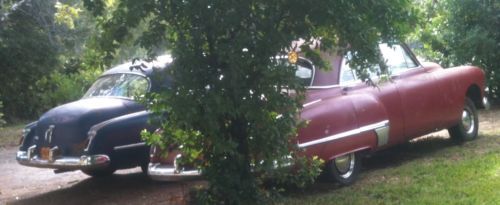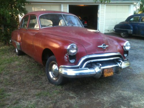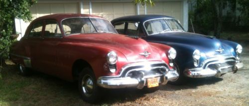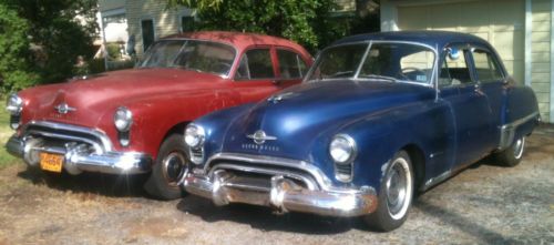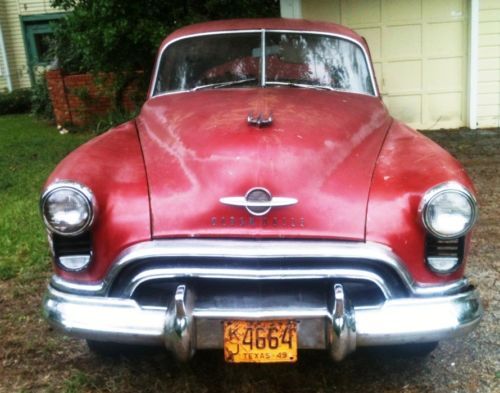 This 1949 Futuramic Oldsmobile 98 was repainted a color close to the original Serge Blue several years ago. It still has the original hubcaps and all five trim rings, including the spare, and has the original fender skirts, which are not rusted at all. It also has what I believe to be its’ original Oldsmobile Rocket Engine, which idles and accelerates smoothly, has no knocks, no smoke, no drips from the engine, transmission or cooling system, and never overheats even in the 100+ degree Texas heat. It has been converted to a 12-volt battery and the engine starts easily when cold or hot. The Hydra-Matic transmission shifts perfectly, cold or hot, and does not slip or hesitate when starting out or shifting through all four speeds. The radial tires are old, but are decent and serviceable as is. This is a great looking ’49 Oldsmobile 98 has that “patina” that brings “thumbs ups” and horn honks, and people take pictures of it wherever you go. It can be used as a daily driver as is or if you don’t want a rusty car, just switch everything over the incredibly nice metallic red 1949 Olds 98 4-door sedan body that goes with it. After purchasing the Serge Blue car in Pennsylvania and driving it from Ohio, I found another, nearly identical 1949 Olds 98 Deluxe Sedan body in Dallas. I bought it from a guy who saved it from the crusher by buying it from the scrapper, knowing that it was too good to scrap. The body is straight, has never been wrecked, only has bondo in one small place on the lower left front fender, but there was some rust in both rocker panels that was previously repaired with fiberglass. The right inner fender panel is missing. The red car must have been someone’s restoration project prior to being taken to the scrapper. It had been disassembled and all of the stainless and chrome plated trim, including the bumpers, etc., had been carefully removed prior to it getting a pretty decent paint job. The paint has suffered from the car setting outside in the weather for what appears to have been many years after the repaint. Although it polishes up nicely, it has some major scratches around the car due to it having been disassembled and the front fenders being stored inside of the car. The blue car was built in Lansing, Michigan and the red car was built in Kansas City, Kansas. The red car was likely originally from the Dallas area and the only evidence of any rust at all was in the rocker panels, which is not uncommon in this area; not from salt, but dirt and moisture accumulating in the rockers.. The red car’s chrome only has minimal pitting and the stainless is virtually flawless. Only one or two pieces of glass are cracked, all of the glass is clear, and has little or no delamination or bubbles. The red car was originally Silver Gray with a Metal Gray top, but repainted what appears to be Firethorn Red or perhaps Honduras Maroon. Much of the stainless, diecast moldings, bumpers, front fenders, grille, and trim were removed for painting, but have since been reinstalled. The whereabouts of the original engine and transmission is unknown. The red car still has the original rear seat and door trim panels, but the front seat was removed and is missing. The rear seat has the remains of the original fabric and the nylon plaid seatcovers that were likely installed in 1949 when the car was new. The driveshaft, emblems, glass, and many other original parts and components remain on or with the car. The rear lever shock absorbers are firm and in excellent condition on the red car, but are badly worn out on the blue car. Whatever the red car lacks, the blue car has. Likewise, whatever the blue car needs to make it a nicer driver, the red one has. Therefore, by combining the best parts and components from both cars onto one, you will have a beautiful 1949 Oldsmobile 98 driver. Once the cars are combined, you will still have an extra body or parts car! The pair of cars is listed locally and I reserve the right to terminate the listing early. You may call me at 903-724-3052 if you have any questions. Good luck bidding!
