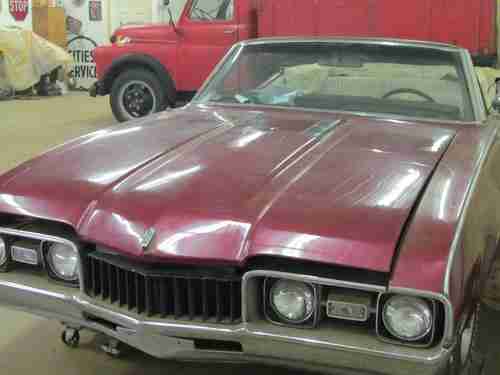 Being offered is a 1968 Cutlass S Convertible. 350 2-barrel/with automatic transmission. Factory air was removed but parts are in the trunk. It is in need of restoration, has been sitting since early 90's. We've had the motor running (runs good) from a gallon jug, uncertain about inner gas tank condition, may need flushed. We have not attempted to drive, due to the brake pedal goes down to floor board. Top has never been up assuming it is in need of replacement. Planned on restoring but recently had shoulder surgery, could use the extra cash. Call Nick 815-eight48-6450 or 815-six35-3310. Thanks for looking. Owner reserves the right to end auction early.
