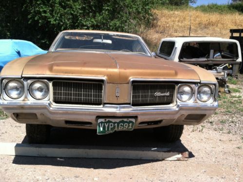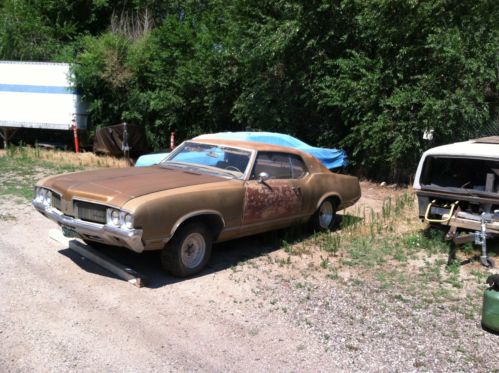 70 Olds Cutlass. This is the 2 door oupe. No post around the windows. The car its self is solid. The brakes work. The wiring looks good. I'll even bet the build sheet is still on top of the gas tank. This car has a clean Colorado title. It's a 2 owner car I think?? It's been sitting since 1995 but it's all there and what is really cool about the car is the grill and all of the grill trim is in amazing shape. The car has all the the body trim and all the lights are there and in great shape. This car really is a clean survivor... There's even a T3 headlight in it still. All the dash is there and in good shape even the ash tray door works and is complete with the oe lighter. The inside of the car is not that great but all of this would make a good sx clone or a w car clone or just a nice street car. All the little hard to find parts are here and in great shape. Now keep in mind when you are biding on this car it is really hard to find a car that is this clean and complete. There is only 3 or so small dents in this whole car. There is also some rust here and there. The car would need some work of course. Just like every old car but the plus side to this car is all the trim/grills/lights/interiorpieces/nobs/switches/etc... are here and all oem parts. Good luck... buyer is responsible for shipping.