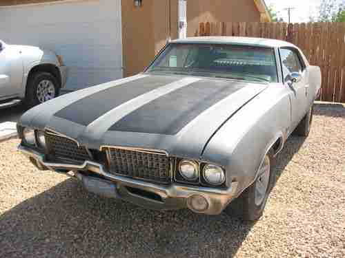 Matching numbers all original 1972 Cutlass Supreme 'Notchback' Coupe, (unfinished). Very solid California Cutlass Supreme, runs excellent-very strong, needs new front bumper and front plastic 'flange', headliner, and front seat recovered basically. Drivers front fender is solid and very usable, or a new one can be bought online. Missing back seat mini-light covers & dome-light cover, and back window bay needs new coreboard replacement. Body needs finishing/painting after new parts installed. Has some minor rust below back window, etc. All original car comes with all FIVE original 1972 factory wheels-(including spare), WITH new radial tires on them, WITH original 1972 factory Olds wheel covers, original jack, stand and base, original SUPER-KOOL Air-conditioning unit-(not on car), ALL original trim, NEW thrush turbo exhaust-(sounds WICKED!), Z-28 wheels and tires seen, new plugs, all new filters, oil change, all fluids and systems check. This car runs very well, very strong and is a very solid car to finish and keep or re-sell as they average around 12k-16k on the open market and NADA guide pricing. You can literally drive this one home!
