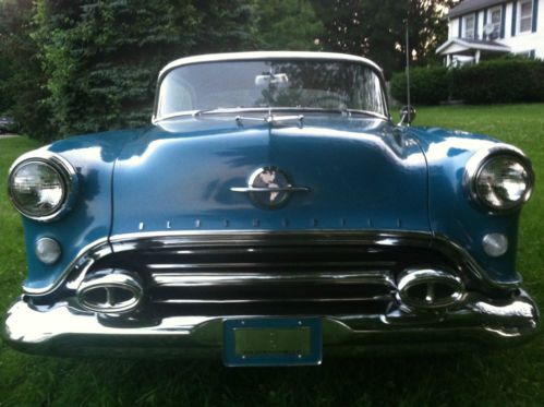 You are bidding on a timeless classic a 1954 Oldsmobile Super 88 Holiday Coupe, no post, totally numbers matching beautiful car. I am only the third owner and due to a back injury I am unable to keep her as it is very difficult to drive without power steering for me. Car was built in NJ and purchased by a couple in Brooklyn NY, the second owner purchased the vehicle from an estate sale and unfortunately the second owner passed away this spring from cancer and I purchased the car from his wife. Car has been garage kept and has the original paint and interior, the roof was repainted by the second owner, the chrome is beautiful on the car and so isn't the engine compartment as you can see from the photos. Car is located in the Hudson/Harlem Valley area of New York. All gauges work correctly, even the clock, This is one of the hardest things to do, parting with this beauty but there is no point having it sitting in a garage not being driven and enjoyed. There are 71752. original miles on her, I replaced the water pump as it was leaking when I purchased her this summer but I kept the old water pump which appears to be the original one. The trunk is loaded with extra parts, gaskets and items for the car.