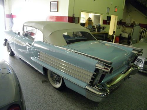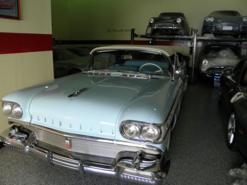 1958 Oldsmobile 88 convertible. This car is distinctive even from a distance, finished in light blue with a blue and white interior, power top with 82,300 miles. It is powered by a 371 CID V-8 with dual exhausts and an automatic transmission. It has undergone a recent restoration and is fitted with a heater ,distinctive trim elements ,power steering and brakes. Chrome wire wheels and wide whitewall tires complete this presentation. Drive or show this car anytime .Please call Al with any questions at 508 237 9999.