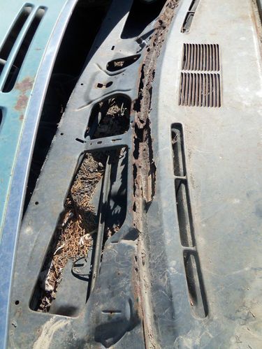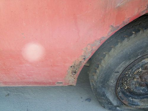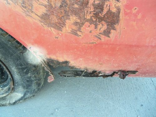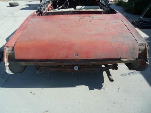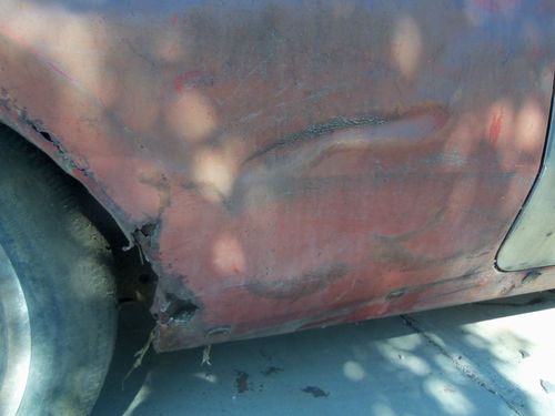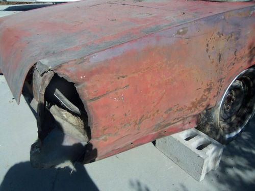 The body is quite rough, but mostly just toward the rear: there is rust around the rear wheel wells on both sides; there is a large dent on the right side rear quarter; there is a large gouge on the right side rear corner; the hood needs new springs; the car has body parts from three different cars, as you can see in the pictures; the front clip is in good shape, with only a few dings