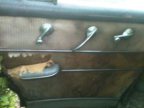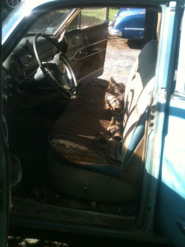 The interior is original, dirty, stained, and showing signs of age and wear. The headliner is torn and some of the seams have come apart. The seats have the remains of very old seat covers. The original front seat fabric looks good where it has been exposed (the seat cover was torn off to see the original fabric). The rear seat covers are on it, but the top of the rear seat and seat cover is badly deteriorated. The instrument panel is complete and looks good. The steering wheel is cracked and the steering wheel ornament is checked.