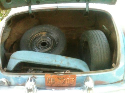 One of the original wheels has been replaced with a later model wheel and the spare is missing. One old bias ply tire is on one of the original wheels, it’s on the ground and holding air, and it may have been the old spare. It is obviously a tire from the ‘50s or ‘60s.
