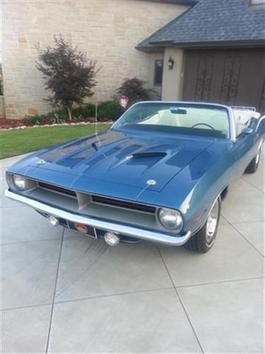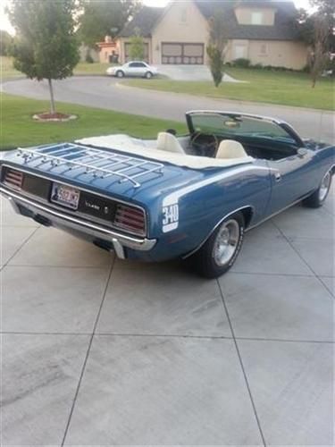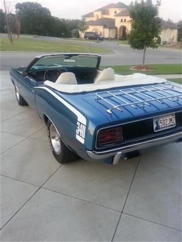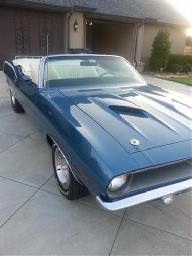 `CUDA CONVERTIBLE 340 4-SPEED 1 OF ONLY 19 EVER PRODUCED ADD IN THE FACTORY EB7 JAMAICA BLUE EXTERIOR AND WHITE LEATHER BUCKET SEATS INTERIOR AND YOUR SURE TO HAVE A 1 OF ONLY 1 CAR, VERY NICELY RESTORED `CUDA CONVERTIBLE 340 AND ITS NUMBERS MATCHING AND A REAL EYE CATCHER ALSO, SHE IS A REAL TURN KEY CAR AND GO TO THE CAR SHOW OR DRIVE ACCROSS THE COUNTRY SHE'LL DO BOTH AND WITH THE TOP DROPED ALSO, EVERYTHING WORKS AS IT SHOULD, CAR LEFT FACTORY WITH A 3-SPEED MANUAL FLOOR SHIFT BUT WAS UP GRADED WITH A FACTORY 4-SPEED PISTOL GRIP HURST SHIFTER, THE ORIGINAL MATCHING NUMBER 3-SPEED TRANSMISSION COMES WITH THE CAR ON A PALLET, THIS `CUDA CONVERTIBLE IS LOADED WITH FACTORY OPITIONS LIKE; WHITE LEATHER BUCKET SEATS AND WHITE CONVERTIBLE TOP, RALLYE 150 MPH GAGE PACKAGE, FACTORY AIR CONDITIONING, HOOD PINS, TWIN PAINTED RACING MIRRORS, REAR LUGAGE RACK, RALLYE WHEELS, FOG/DRIVING LIGHTS, POWER DISC BRAKES AND THE LIST GOS ON. SHE A REAL FUN CAR TO DRIVE AND IS A VERY QUICK AND NIMBLE CAR AND IS ALSO VERY RELIABLE AND CAN BE USED FOR EVEN A DAILY DRIVER IF WANTED. PLEASE CALL FOR FURTHER DETAILS: RANDY @ (602) 206-3509