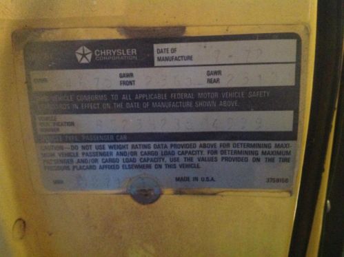CODES:>>>>>>>>>>>>>>>>>>>>>>>>>>>>>>>>>>>>>>>>>> N41 DUEL EX. N42 CHROME TIPS N85 TACH R11 AM RADIO V08 PAINT/TRIM WAIVER M21 DRIP MOLDING M25 SILL MOLDING M31 BELT MOLDING M88 DECK MOLDING N23 ELEC IGNITION G36 PAINTED LEFT AND RIGHT HAND MIRRORS H51 AIR CONDITIONING J25 3 SPEED WIPERS J54 RALLY HOOD L25 TRUNK LIGHT L31 FENDER TURN SIGNAL INDICATORS FY1 TOP BANANA U ORDERED CAR B51 POWER BRAKES C16 CONSOLE G56 BUCKET SEATS G11 TINT A06 LIGHT PKG F6 GREEN 000 630 JUNE 30 1972 E55 340 4BBL D34 AUTO V6X BLACK SIDE STRIPES |