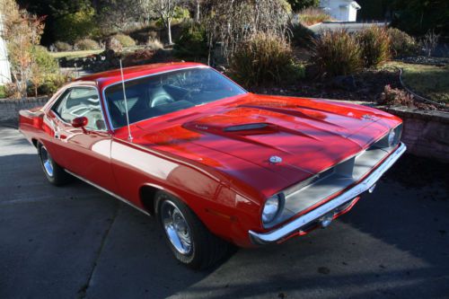 Very rare, numbers-matching, original drivetrain Plymouth Cuda with factory air that was purchased in Sacramento, California about 15 years ago. Upon purchasing the vehicle, I drove it 300 miles to my home in Northern California. It was a very solid driver then, but it took some time and money to make it the car it is today. Mechanically speaking, we took care of the brakes, suspension, shocks-- normal wear items that we addressed. Cosmetically, the headliner needed help and the paint was dull, but all of the panels seemed to be original and in great shape. We had the bumpers re-chromed, but most of the trim and grill, etc. was in awesome shape. Some of the weather stripping was also replaced as needed. I had it professionally repainted up to show-quality standards. Everything on the car works and it is very enjoyable to drive and to proudly display at shows. I am an auto dealer, but this car is a part of my private collection, and I have stored it in a climate-controlled garage for the entire time I've owned it. I am selling this Cuda now because I feel that I do not give it enough time on the road or at shows, where it can really shine as a classic California automobile.