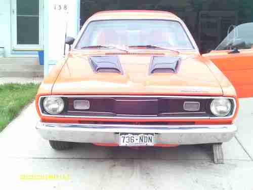 THIS CAR WAS MY SON SCHOOL PROJECT THAT NEVER GOT FINISHED,SO I DID IT.STARTED OUT AS A PLAIN JANE DUSTER,318,3 SPEED DRUM BRAKES,BENCH SEAT,SKY BLUE CAR.TORN DOWN COMPLETLY AND STARTED FROM SCATCH.FRONT SUB FRAME PULLED OUT,CLEAN AND PAINTED,DRUM BRAKES TOSS,PUT IN 1975 DISC BRAKES.REAR END TOSSED AND SPRINGS,PUT IN 1976 8 3/4 ONE AND HEAVIER SPRINGS PUT IN,ALSO HI-JACKER AIR SHOCKS AND SHACKERS.I HAVE A POSE-TRAC FOR IT BUT NEVER PUT IT IN.THE MOTOR IS FROM A 78 TRAILDUSTER,IT COMES UP AS A EARLY MAGNUM,IT BORED OUT .040 OVER ,STREET CAM,EDELBROCK MANIFOLD AND 650 CARB,MAYBE AS 10K ON IT.TRANNY IS OUT OF EARY 70 MOPAR 883 MODEL 23 SPLINE,HURST COMP PLUS SHIFTER.SO MOST EVERYTHING HAS BEEN CHANGED UNDER CAR.BODY WAS COMPLETELY TAKEN DOWN TO BARE METAL,WAS RUST IN CORNER OF FRONT FENDERS,PATCH AND FIXED.RUST IN REAR LOWER QUARTERS,MADE A PATCH FOR IT,FLOORS WERE OK.SEATS WERE TOSSED AND 75 BUCKETS PUT IN,SAME FOR REAR SEAT.DASH IS ORG.,DASH PAD WAS COVERED WITH NEW PAD.GOOD SOUND SYSTEM PUT ,HAS 500 WATT AMP AND 4 SPEAKERS.WHEELS ARE ONE OF KIND CRAGERS MODS 14INCH,ONLY MADE THEM FOR 2 YEARS, BF GOODRICH 60S AND 70S IN GOOD SHAPE.COLOR IS CALLED SUNFIRE ORANGE,WITCH IS STARTING TO FADED.REDONE ABOUT 8 YEARS AGO,ONLY PUT ABOUT 10K ON IT.GOOD LUCK BIDDING ON IT,IF YOU GET IT YOU WILL HAVE FUN WITH AND GET LOOKS TOO.