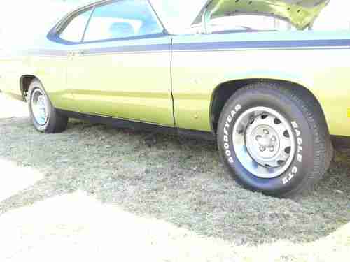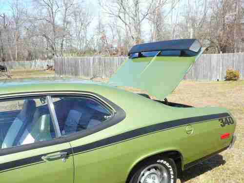 I am listing this 1972 Plymouth Duster for a friend. The car is in excellent condition. It is an older restoration about 7yrs. It was professionally done. The car does not have any bondo it is all metal. It is garage kept. The color is the original mopar green, base clear coat and buffed to a beautiful shine. It is accented with flat black rockers, lower fender and lower quarters. The hood is also black. There was a 340 decal on the hood. The owner was going to have it airbrushed on, but doesn't have the time. The engine is a 340 and the trans is a 727 torque flyte. Both the engine and the trans run perfectly. The car has dual exhausts. The brakes and tires are in great condition. There is only a little over 16000 miles on the car as verified by the title as actual miles and the odometer. The interior is beautifully done in the original green with white accents. Check all the pictures. It was a bit sunny and the car may not appear green in some shot, but be assured the entire car is the same color. This is a turn key car. Start it up and drive it home. The only thing you need to decide is whether you want another 340 decal or a painted one. That doesn't take anything away from this car. The car is priced right for a Mopar. It's hard to find many of these that are not rotted away. The car is also being offered locally and is being sold as. No warrenties implied. There are no disappointments with this ride. Any question will be answered asap.