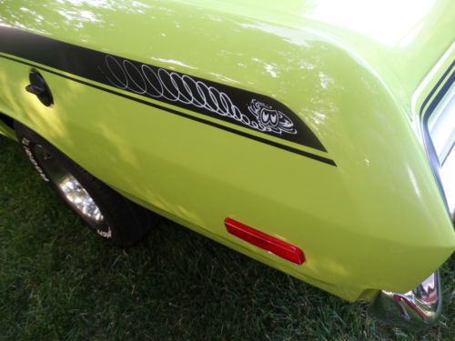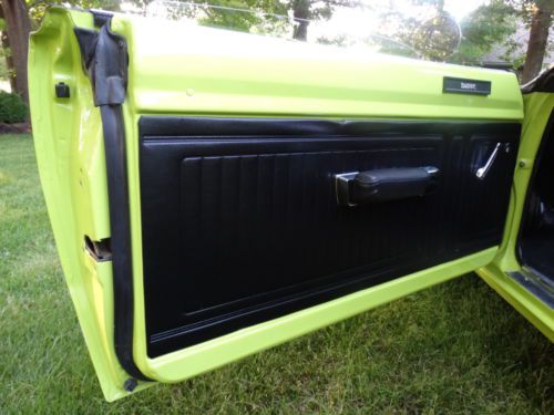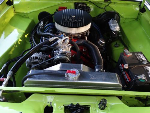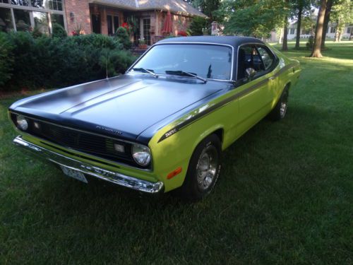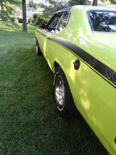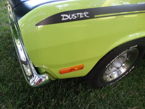Professionally restored 1972 Plymouth Duster. This vehicle is a ground up total restoration. Rebuilt 318 engine with mild cam, headers, electronic ignition. Aftermarket ice cold AC. Late model comfortable bucket seats. Beautiful paint job, base coat/clear coat in sub lime. The body panels are straight as an arrow. Black accent stripes and black hood. All rubber has been replaced around doors, trunk, hood and beyond. Automatic rebuilt 3 speed transmisson shifts fast and right. The engine is rebuilt and runs like new. The rear end appears to be origional. Interior is nice. This car has won awards, one best of show shown in pics. New windshield, rest of glass is dated. Aluminum radiator. Window washer works as it should. Bottle is under hood now, not shown in pic. Newer tires with nice ralley wheels. Trim rings have not dents or damage. Trunk mat has been replaced, Cover board over spare replaced, with new spare. Jack is in place. This is a car you can drive to work every day, or show on the weekend. Not your usual quck restoration project.Nut and bolt restoration. A car you really need to see and drive. Very dependable. I would recommend taking a look at the car if possible before purchase. Mileage exempt, not sure of actual mileage. Car sold as is no warranty. |