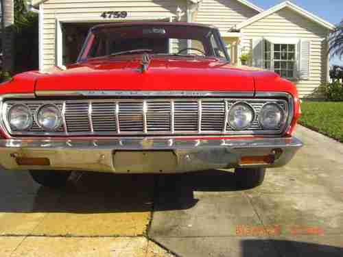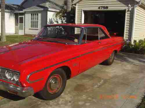 ORIGINAL 1964 PLYMOUTH BELVEDERE, V/8 318 ENGINE, PUSH BUTTON 727 TRANSMISSION, POWER STEERING, MANUAL BRAKES, 1 REPAINT, RUBY RED, RED INTERIOOR, 4 NEW SHOCKS, SIDE MOLDINGS AND WINDOWS VERY NICE, ORIGINAL 14 INCH WHEELS AND CENTER CAPS, EVERYTHING WORKS BUT THE RADIO, HORN WORKS,INTERIOR NICE, HEADLINER NICE, NEEDS FRONT END ALIGNMENT FROM NEW BALL JOINTS BE PUT ON, PAINT NOT PERFECT BUT VERY SHINNY, RUNS GOOD STARTS ON FIRST TURN OF KEY, VERY LITTLE RUST AND A FEW BUBBLE SPOTS, GLASS NICE, WAS ORIGINAL A/C CAR SOME PARTS ARE MISSING FOR A/C, PUT A BIG BLOCK IN AND DOUBLE YOUR MONEY. , THESE ARE HARD CARS TO FIND. WILL TRADE FOR ANOTHER MUSCLE CAR.DONT LET THIS ONE GET AWAY VERY HARD CAR TO FIND.