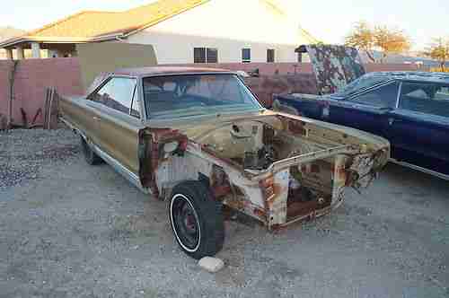 This is a 1967 Plymouth GTX real 440 car, needs total restoration, the satellite next to it come with the 67 GTX and the fenders you see also, fenders are in excellent shape, all the floors are solid maybe 1 or 2 holes but nothing that is a really big issue, the trunk pan passenger side has been pushed up like it was parked on a rock this looks like it could be pushed back down and re welded, or you could use the donor car and replace that side with the donor car, the rockers and quarters look good on the GTX, what you see in the photos is what we have for the car, if you need any additional parts we might be able to help you with it, the donor car is in great shape and would make a great clone.