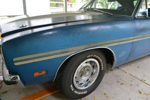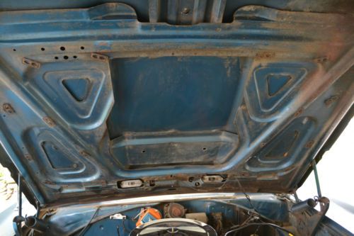 Car is very solid with very little rust. New quarters were installed before my uncle purchased it in 1993. Right front fender looks like it was replaced at some time due to the fact that the car was undercoated when new and the right side fender has no undercoating on it. All other metal is completely original and rock solid. Although the car looks like it had a repaint many years ago the car retains Most of the original paint. Hood/Deck lid stripe is not original to the car. The lighter blue has faded off and actually rubs off the darker B7 original paint where it still left. Unbeilievably solid rockers/ fenders/doors/ and floor boards. Trunk is super solid with small rust holes where the trunk meets the wheel well. Right front fender is a little beat up but rest of car is pretty straight. There is rust on both bottom corners on the rear windows. All glass except the windshield are original. Interior needs a headliner. Seats have been recovered and the original door panels look good. Seat backs need painting. Interior is over all in very nice shape. Front bumper is a new one and the rear one looks great.This car is not a show car but original unrestored vehicle. Could be a driver super quick and its only original once. That being said this car would make a killer restoration. New parts installed with in the last year are a complete PST front end rebuid kit everything done. Bushings, bearings, tie rods ends everything replaced and then aligned by the neighbor hood firestone dealer. Brand new BF Goodrich tires. New front brake lines soft and hard. Complete brake job, I sent original 11" front shoes to a shop for relining. Wheel cylinders shoesall around. New shocks, RPM performer intake, new Holly 770 street avenger carb, new gas tank and sending unit. New Mancini Racing electronic ignition/ wires/ plugs/ coil. Many new parts all new light bulbs throughout. many other items new. Newly rebuilt stearing gear box. New repo nice chrome mirrors and a rare eight track player and TIC TOC clock/ hood turn signals included. Nothing hidden very solid. Car runs and drives but will need to be trailered. Transmission leaks. I thought it was the pan and replaced it with a new one and it looks like its coming from the shifter above the pan. Engine runs and fires right up but has a noisy valve train. I think the motor needs a rebuild but does run and doesn't blow smoke. Odometer reads 42,561 but I assume it has rolled over. A $500 deposit is required with in 24 hours of purchase and final payment arraignments and pick up of vehicle within one week. Cash is king. No warranties car as is. |