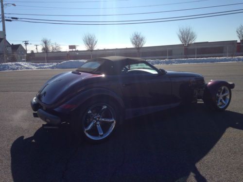 YOU ARE LOOKING AT MY 1 OWNER PROWLER THAT WAS BOUGHT NEW IN 1999, THIS CAR WAS MY BABY AND ITS TIME TO PART WITH, I WASNT THE GUY THAT LET IT SIT, IT WAS DRIVEN AND STORED IN A HEATED GARAGE. EVERYTHING ON THE CAR WORKS AS IT SHOULD. TIRES ON THE REAR ARE ABOUT 60%, FRONTS ARE ABOUT 60%. PAINT ON THE CAR SHINES GTREAT WITH VERY MINOR WEAR AS IT DOES HAVE 88,000 MILES. TOP IS IN GREAT CONDITION WITH THE EXCEPTION OF A 2 INCH GOUGE (PLEASE SEE PIC) RIGHT REAR AREA. THIS CAR IS A BLAST TO DRIVE AND TURNS HEADS EVEREYWHERE. WE PUT A RECENT BATTERY IN IT AND LIKE I SAID IT IS STORED IN A CLIMATE CONTROLLED GARAGE. INTERIOR IS IN GREAT SHAPE WITHOUT ANY TEARS, LEATHER SEATS ARE IN GREAT SHAPE FOR ITS AGE. EXTERIOR WHEELS ARE IN GREAT SHAPE WITH MINOR CURB RASH ON A COUPLE OF WHEELS (SEE PICS)