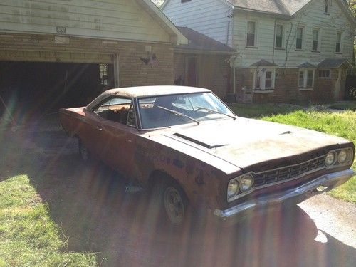 For Auction a 1968 Plymouth Road Runner, I do not have title yet, in need of complete 100% restoration. Quarters, Flloors and trunk floors need replaced, car need completer interior. car sat in wet marsh area and rusted out. A car like this is a great candiate for a prostreet car, or race car. I do not have the title, but the gentleman who sold it to me is the original owner, he is 85 years old, and has trouble locating so were filing for a lost registration then we can get a new title. I have not started the motor, believing its better for someone who knows more then I do. has 383 4 barrel, hurst 4 speed and 8 3/4 rear, has aftermarket A/C, motor is the 335HP motor. car is all original just as it was parked,many years ago in his yard. These are hard to find and are exspensive when finished, I just don't have the money or time right now, family medical emergencies. text or ask any question I'll do my best to answer. James 856-857-4750 please no scam offers I heard it all, your creativity is not appreciated and will be reported.