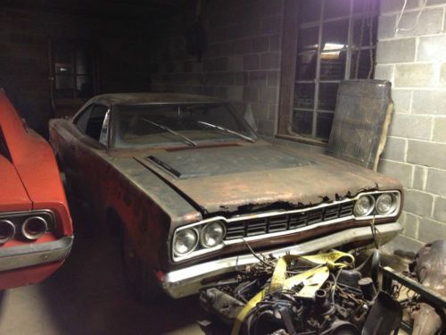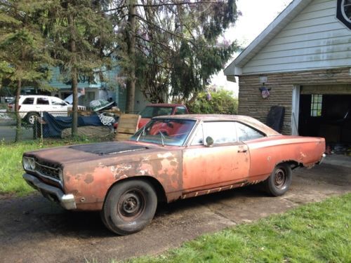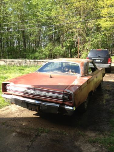 Have Title, 1968 Plymouth Road Runner, 1 owner car, bought new Auigust 1968,car is being sold, with clean, clear brand new title from original owner, im also including another 1966 383 engine complete, with auto trans,and 8 3/4 rear with springs, and hardware. The road runner is a original 383 HP, with original hurst 4 speed, trans,after market chrysler AC, with sears? venting box. and 8 3/4 rear. car has been stored outside in the eliments,about 15 years, car doesnt run and is rusty, needs quarters, fenders, trunk, frame is nice solid and strong,glass all there. has black interior, seat are there, black carpet removed. interior needs redone. Motor hasnt been started or ran.. Car would make a good race car or restore, or father son project. This is the first year of the Road Runner.I need to sell, relocating back to florida and cant take it where im going. please call or text any questions, Im looking for 68 dodge charger fiberglass doors, and race hemi parts. No Scams, No Trades, And if YOU think you live too far, dont bother contacting me. I would help with any type of shipping, once paid, even consider delivery if within reason. . If your not in the USA, or on Dry ground do not contact me either. thank you, James. 856-857-4750