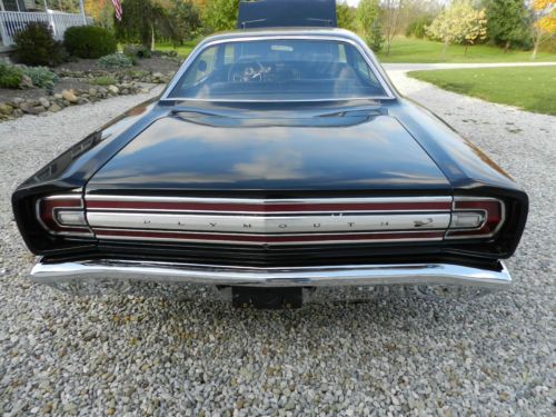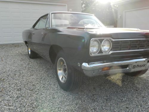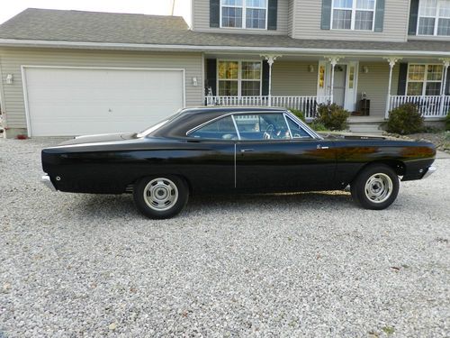 1968 Plymouth TRUE Roadrunner - not a clone. All numbers matching (motor and trans). This is a true black on black car. Bench seat, 4 speed, manual steering, manual brakes. Brand new gas tank and fuel lines. Motor has recently been rebuilt. Electronic ignition has been added. This car has an aftermarket Edelbrock carburetor, but the original numbers matching carb is included. Seats have been recently upholstered and are in great shape. Chrome is in good shape and all is present. Front windshield has a small chip. I have the replacement window but I have never put it in the car. It will go with the car. There are no cracks in any of the windows. Sheet metal in the doors is in excellent condition. There is no rust around the seems of the doors. Front fenders are excellent, no holes or pits. The hood is in good condition. There is a dent that has been repaired on the underside that is not visible from the outside. There is no rust on the hood. The trunk lid is in great condition. There is no rust in the seams. The trunk floor however needs replaced- it has rusted through. The car needs both quarter panels replaced due to rust on the lower sides. Frame, floor pans, and both inner fender wells are in EXCELLENT condition. The car has a new exhaust system, clutch, pressure plate, and throw out bearings. The car has no leaks, runs good, shifts good and is an all around great car. Tires are 15 X 7 police car wheels in fair shape. It comes with the original 14 X 7 road wheel rims. Clear title. AM radio.