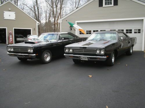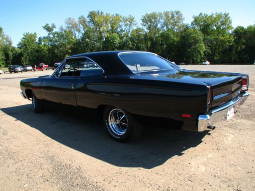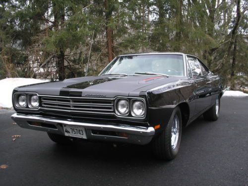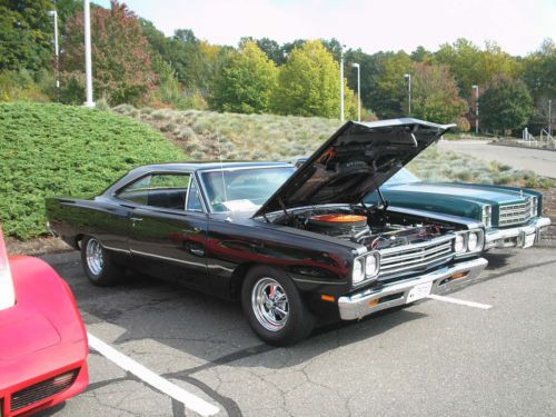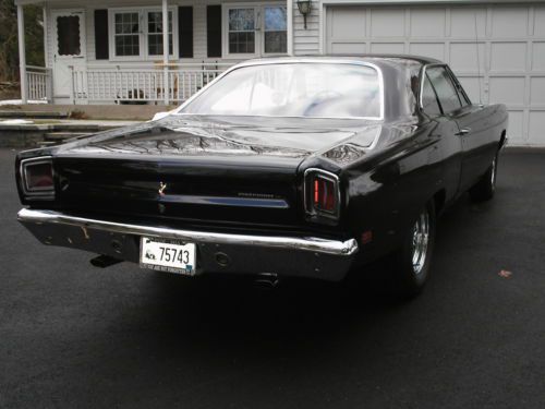 69 Road Runner 383 Factory Air Grabber Car,4 spd 200 mi on numbers matching engine,with numbers matching trans,484 purpleshaft cam,30 over all new internal parts complete cylinder head overhaul,New flywheel and clutch,New radiator,starter,fuel tank,demon 750 carb,mopar msd ignition ,distributer,hooker headers.Car has recent interior seats redone and headliner,Nice dash factory am/8 track aftermarket gauges.Car has lazer straight body ,very deep black paint, All floor pans and trunk w/quarters replaced.Low mi.on tires and wheels Car now has crager ss and does nt come with magnum 500s.Hurst 4 spd shifter.I am listing this car for a friend ,Car is for sale locally we reserve the right to end auction at anytime.for additional information call Dennis 860 295 9588.