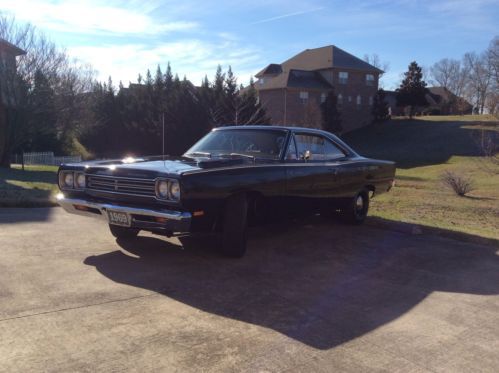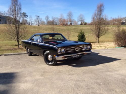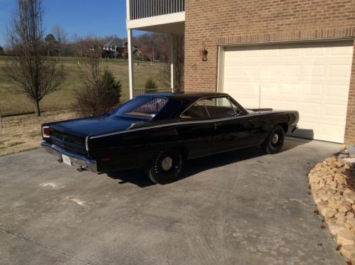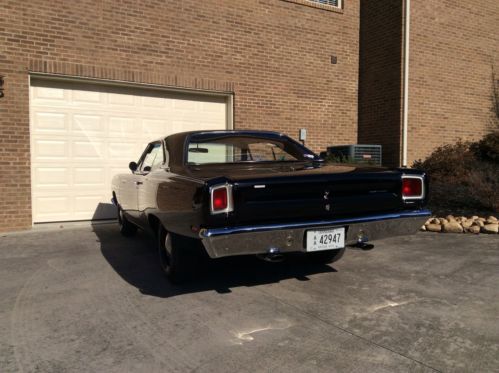 1969 Plymouth RoadRunner hardtop, black with saddle tan interior, 426 c.i. engine, 4 speed and Dana 60 rear end. Exterior color of car was changed from Bronze Fire Metallic (T-5) in the early '90's by a former owner. Car has since been repainted by this owner in 2007 using PPG single stage. Beautiful car, meticulously maintained and cared for with absolutely no issues. Car sits on a 4post lift which I use to clean the underneath after every outing. Everything works down to the ignition switch illumination when door is opened. Car was researched by Galen Govier in 2003 and is listed in The Chrysler Registry.