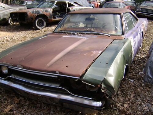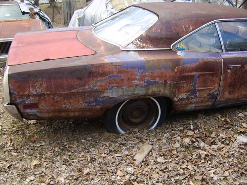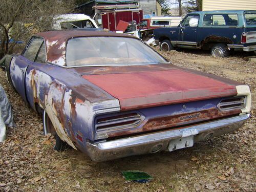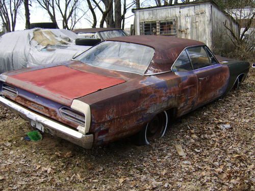 up for sale is a 1970 Plymouth Road Runner in need of a total restoration. Car has the original 383 engine and 4 speed transmission with the pistol grip shifter. Original color is purple with a white vinyl top and interior is white. Body has rust and needs quarters and roof has some rust. Driver side fender is damaged but I had used the fender that came on it for another car so this car was not in an accident . Frame is really solid from what I can see but may need some small spots fixed and floor does have a few bad spots.Driver door lock plate needs to be fixed as door does not stay closed. Original miles I believe is 46,000 and car did run when parked 10 years ago but I have not started it since. It does turn over so it is not seized up. I have other front fenders to go with car and some other parts can be purchased separately. Buyer is responsible for pick up or shipping upon full payment at the end of auction and car can be stored here till arrangements are made. If you have any questions feel free to ask.