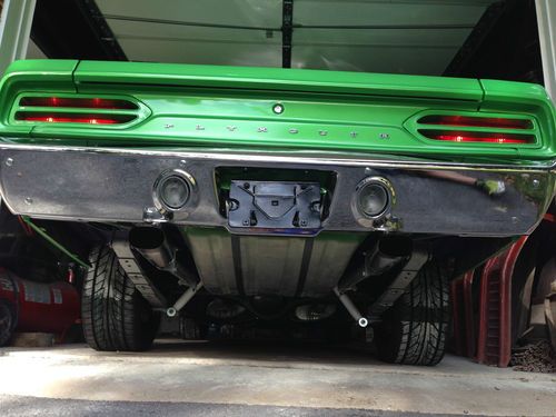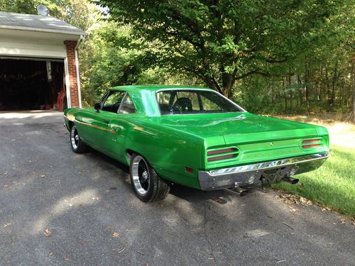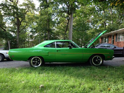 1970 Road Runner - This eye popping Synergy Green metallic beauty has been rotisserie prepared to provide a completely rust free car. Virtually every nut and bolt has been reconditioned or replaced. The period correct 383 big block has been rebuilt .040 over with 440 heads and has zero miles, as does the rebuilt 727 transmission. Front disc brakes have been added along with an all new suspension. Rear air shocks allow "you' to set the stance as you like. The exhaust system is completely new from the headers to the cool Roadrunner chrome tips. Also, new are the gas tank, sender, gas neck, etc. The old type points ignition has been upgraded to a completely electronic unit. Other new engine bay parts are too many to list here. The interior is all new and has been enhanced with bucket seats, a B&M star shifter, and a custom designed and built console. An awesome modern technology, retro look stereo with auxiliary connection, completes the experience. The body work and panel spacing are clean. The black trim along with the 17 and 18 inch wheels (US Mags) with Nitto tires are a perfect look. They are driven by the Chrysler 8 3/4 sure grip rear with 3.91 gears. This is a one of a kind "MS Custom".