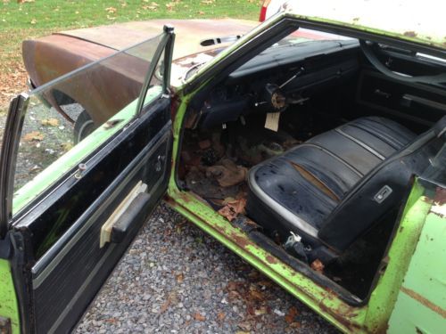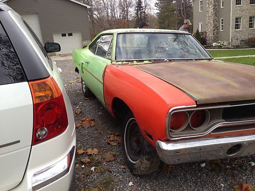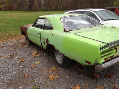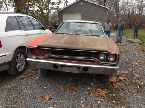 FOR SALE IS A BARN FIND 1970 FJ5 SUBLIME GREEN ROADRUNNER 2 DOOR HARDTOP. CAR HAS NO MOTOR OR TRANNY. FULL INTERIOR WITH NICE DASH PANEL. HAS CLEAR PA TITLE AND BUILD SHEET. CAR WAS ORIGINALLY A FJ5 SUBLIME GREEN, 4 SPEED, WITH HOOD TREATMENT. NEEDS TOTAL RESTORATION BUT HAS NICE CENTER FLOOR BOARDS. TRUNK IS GONE, REAR END IS GONE, TORSION BOXES AND TRANNY FRAME AREA IS REAL NICE. CAR SAT IN A BARN SINCE 1978. PLEASE DON'T GET CRAZY WITH QUESTIONS. CAR IS WHAT IT IS. FRONT FENDERS, HOOD, GLASS, INTERIOR, ROOF,GRILL, ARE ALL DECENT AND USABLE. ALL SHEET METAL NEEDS REPLACED BUT THIS IS A RARE AND COOL CAR. 4 SPEED, 383 , SUBLIME GREEN ROAD RUNNER. BOUGHT THE CAR AND GOT ANOTHER PROJECT SO MUST SELL. THIS CAR IS LISTED LOCALLY SO AUCTION MAY END EARLY. BID TO WIN.