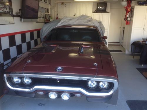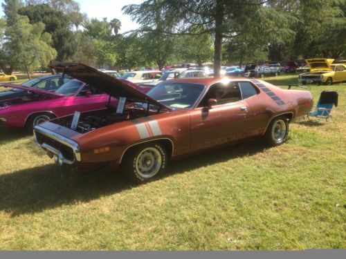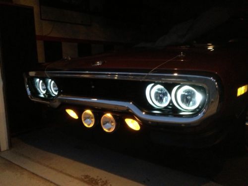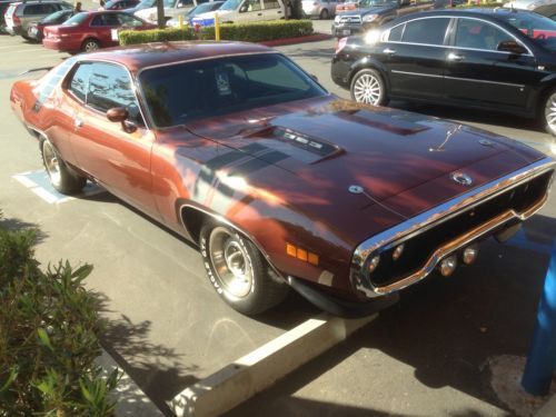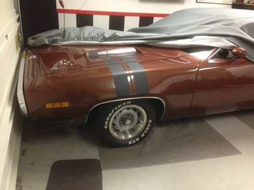 The road runner is Extremely nice, highly optioned 1971 Plymouth Road Runner 383. Extremely nice, real RM23, 1971 Road Runner with 383 and ice cold A/C, console slapstick Automatic with rear posi with power steering and power disc brakes and bucket seats. Extra nice paint, much better than driver quality, absolutely makes the car! Front chin spoilers, rear spoiler, hood pins and exhaust trumpets. Inside and out, this is a one of a kind Road Runner. The drivetrain is exceptional, the interior is brand new and also it comes with original interior in excellent condition too. This one is exceptional inside and out. Factory Codes are e65-383-4bbl, D32-HAD 727 TorqueFlite Automatic Transmission, N1G 383 300hp, GK6 Dark Bronze, M6X9 medium Vinyl Bucket Seats in Black TX9 Upper door frame black/black Velvet, C15 Build date 12.15.1970, V1X Full Vinyl top, A87 Road Runner D cor Pkg which includes custom vinyl trim, rear bumper tape treatment, hood scoop sport stripes, deluxe steering wheel and wheel lip moldings, B41,B51 Power front disc brakes and rear drum are brand new, C16 Console with C55 Bucket seats, G11 Tinted Glass, H51 AC & heater, M21 Roof drip rails, R11 Music Master AM Radio and V21 Hood performance Treatment and 26in Radiator, N41 Dual exhaust w/out the tips but added are N42 exhaust trumpets, J45 Hood pins, and A45 front and rear spoilers And 3 INCH EXHAUST WITH FLOWMASTER. NADA.COM BLUE BOOK IS $49680.00 . EMail ME IF YOU HAVE ANY QUESTIONS OR IF YOU NEED ANY PICTURES. BUYER IS RESPONSIBLE FOR SHIPPING AND PICK UP AND CAR IS SOLD AS IS. INSPECTOR ARE WELCOME TO CHECK THE CAR ANYTIME. ALSO I AM LOOKING TO TRADE WITH: 1. VIPER GTS. 2. DODGE CHALLENGER 392 HEMI. 3. FORD COBRA SHELBY BACKDRAFT ONLY. |