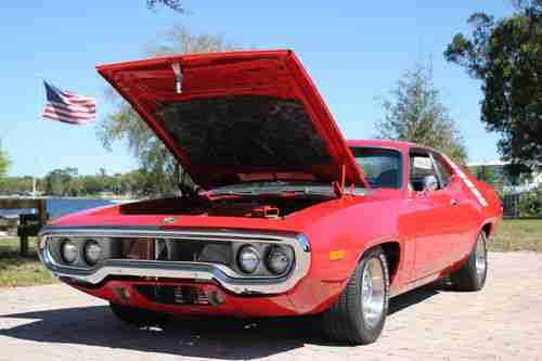 A REAL HEAD TURNER AT ANY CAR SHOW UP FOR SALE A 1972 ROADRUNNER FUSELAGE LODGE BODY STYLE, 400 CI, NON MATCHING BIG BLOCK WITH A 727 AUTOMATIC TRANSMISSION , CONSOLE AND BUCKET SEATS WITH THE SLAP STIK SHIFTER, SHORKLE AIR CLEANER, P.S, RALLEY GAUGE PACKAGE , NEW SEAT COVERS AND CARPET, PAINT AND BODY WORK LESS THAN 2YRS OLD ,THERE ARE A COUPLE OF PIN HOLES IN THE TRUNK RIGHT SIDE WHEEL WELL NOTHING SERIOUS, NEW FRONT END AND K FRAME ,BRAND NEW RALLEY WHEELS AND TIRES LESS THAN 300 MILES ON THEM ,,,,,, BUYER IS RESPONSIBLE FOR SHIPPING AND OR PICKUP ,,, CAR IS SOLD AS IS WITH CLEAN TITLE THANK YOU.