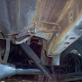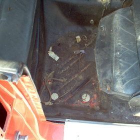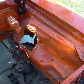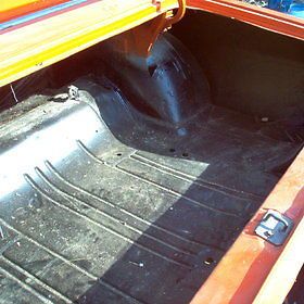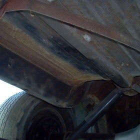 The floor pans are solid (there is a small raised bump on the rear floor pan.See pic) It looks like a floor jack or stand pushed up a little on it. It will go back down with no problem. Trunk pans are solid as well. Frame rails are good. The inner fenders are solid except one that will need patched ( see pic)