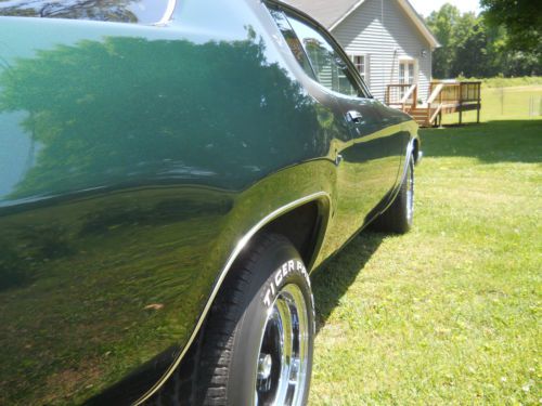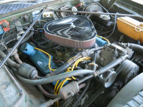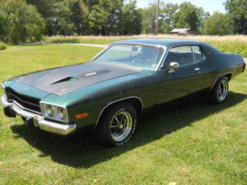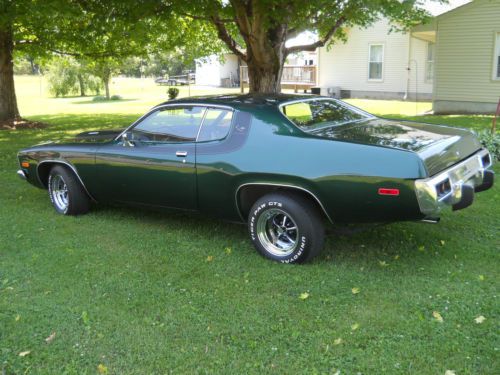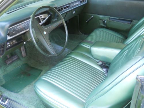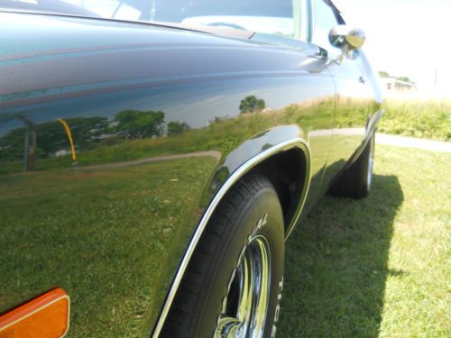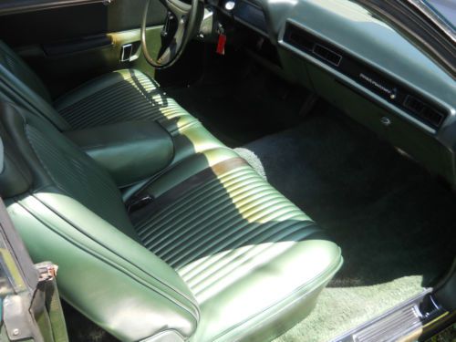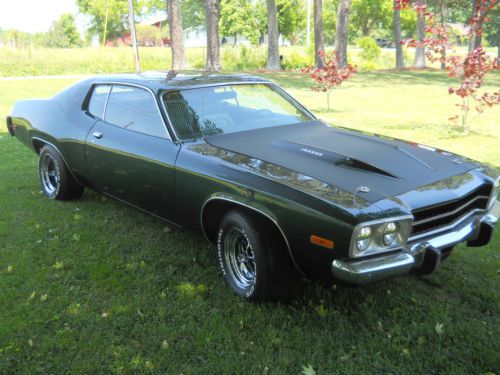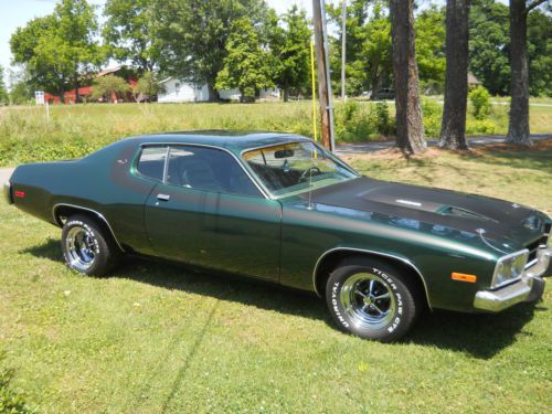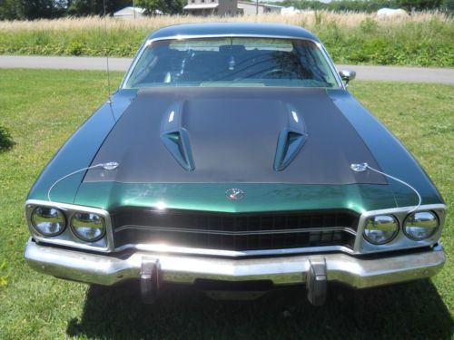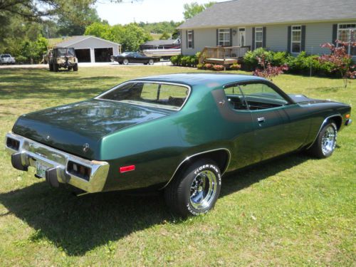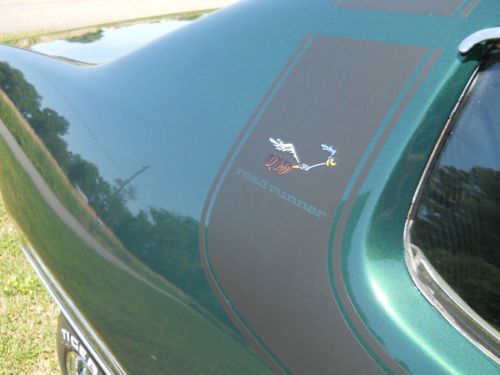 here is probably one of the best looking paint combinations I have ever seen on a 73 74 roadrunner, this car started out as a 73 satellite, factory green with green interior, the car is now a 73 roadrunner with correct emblems and decals, including the beep beep horn and dash emblem, it has beautiful dark metallic green paint with matte black hood, it has matte black stripe kit from American restoration products a licensed mopar distributor, hood has factory (thick) hood pin kit and also matte black stripe kit which really sets it off, paint is beautiful, car is straight as an arrow, no rust very clean trunks and floors are in excellent condition, car was purchased in central Alabama and has been in south its entire life, interior is very nice, seats are original and in excellent condition they were covered with plastc from the dealer until a couple years ago, car has a smooth running 400 big block with 727 transmission, new magnum 500 chrome wheels 15x10 on rear and 15x8 on front , all this car needs is a headliner which is currently removed, car sounds awesome with flowmaster exhauast giving it a deep rumble, this is a very stunning car with beautiful paint, a/c is complete with everything intact just needs recharging, car is a pleasure to drive and gets a lot of attention, I have had a lot of mopars but this one is the most impressive as far as being a real head turner and getting constant shout outs, all it needs is to be driven and enjoyed , this car will make a great addition to any collection or to be a cruiser or show car, all the hard work is done, feel free to ask any questions or call (931)581-0612 anytime.......Alvin.