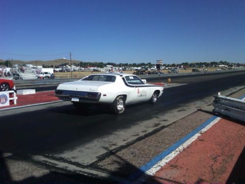 Arctic white 1974 Plymouth Road Runner; NHRA I/SA (stock class), 400 big block, Ross pistons, Isky cam, Total Seal rings, 727 Torqeflite, Coan converter, 8 3/4" rear end. 372 horsepower on gasoline. 3400 lbs. w/driver. Runs high 12's in 1/4 mile at Bandimere Speedway in Denver. Runs low 12's at sea level. Can be converted back to street car. $7,500.00 turnkey. Rolling chassis only (no motor/trans) $4000.00. Serious inquires only. Call 719-660-twenty one 98