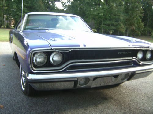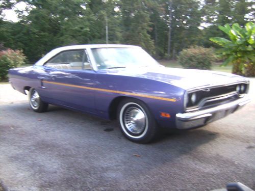 1970 roadrunner !! -- All matching numbers -- !! Original Motor , Original trans , ( both rebuilt with receipts ) door VIN sticker , dash VIN tag , and title , radiator support , trunk lip , and 2 original broadcast sheets !! no fender tag , but can easily get one, from the info on the broadcast sheet. It looks good , runs great , needs mostly cleaning and details , and finish it up to your liking ! maybe you prefer a vinyl roof , or a blackout hood , or ? -- please call with any questions or if more pics are needed. inspection , and test ride during the auction is welcome Must sell call Peter 434 548 4773 we are moving Original 2-tone painted car ( per broadcast sheet ) with white painted roof and purple body. Factory Power steering ,pump leaking, and factory A/C , all there , not working , compressor free. White bench seat interior is in very nice shape. replaced with legendary interiors , door panels , seat covers , headliner, carpet , and more. it needs new or redone seat belts , armrests/bases ,and the dash gauge bezel is cracked , all the gauges do work including the fuel. it has a new fuel tank and sending unit. the dash pad has a cover over it and i would replace it with the correct one even though it looks good. All metal was repaired nicely 4 or 5 years ago with pics included. It received Floors , quarters, trunk , extensions ,and any rustproofing or other repair it needed. at that time the owner passed away and it ended up being given to the shop owner. The next owner has had all the work since done , bringing it back to life. It has a nice original color , base coat - clear coat , paint job. I would rate the paint 7 or 8 out of 10 . this is a nice driver quality car , needing more to be nicer . Mechanically it is very good and it runs strong. The tires , wheels and factory hubcaps are good. It has new exhaust , suspension , brakes ,and lots more . It is very nice , and clean , and mostly all new and correct underneath. It still needs lots of small things , and maybe some rally or road wheels , instead of the plain factory hubcaps. It needs lots of cleaning and details overall. The following info is from a letter , from the last owner , that had all the work done.