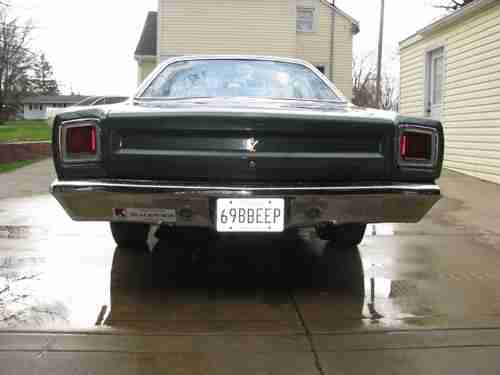 This is one awsome REAL Roadrunner, with NO RESERVE. The car has had both rear quarters put on it but they did an outstanding job. The car is very very solid. The paint on the car is real nice driver paint, there is some stains on the top of the car from bird shit, I was told you can wet sand and buff that out. The chrome on the car looks real good if not close to new. The interior needs nothing it looks new, and great. Everything in the car works even the BEEP, BEEP horn. The engine is NOT the original motor, but runs great, The car shifts great as well. The trunk had a new peace put in it so its solid now. The red line tires have a lot of tread on them. The reverse lihgt in the car even works. An older man owned the car and due to heart attacts had to sell it . This car was his baby, he put all kinds of new stuff in and on this car.This car rides and drives great.There is no fender tag or build sheet with this car. I reserve the right to end this auction at any time. If you have any ? please call 419-571-9777. remember NO RESERVE. YOU WILL BE VERY HAPPY WITH THIS CAR.