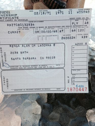 My father drove this classic off the show room floor in 1968. He has been the only owner of it, and it has spent its entire life in Santa Barbara, CA. He left it to me after he passed, and I am now starting a family of my own and will sell it if the price is right. It has all matching, major original parts. There are very few of these cars in existence today, and even fewer with these features and in this condition. Odometer reads 36,586 but it has been around once and stopped working 7 years ago, but since that time it has been driven very rarely. The interior has been reupholstered, and the top is not original....my father was an upholsterer and did an excellent job on these. There is very minimal rust around the rear wheel wells, but other than that it is rust free. I can answer any questions you have about it 619-665-8655 a_renga@Hotmail.com