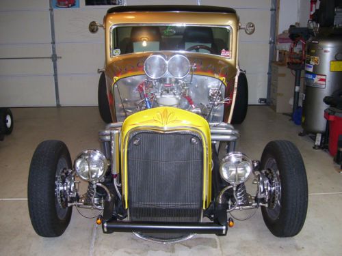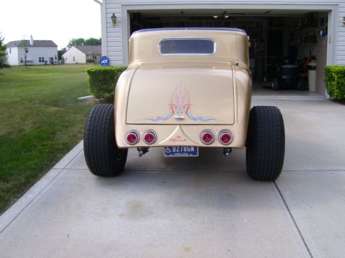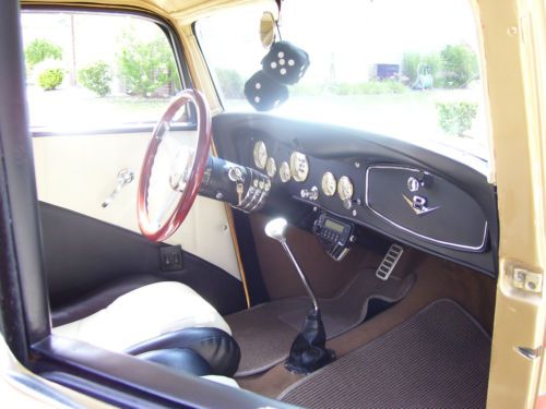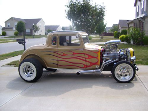 Up for auction is a 1934 Plymouth coupe, steel bodied car, with original suicide doors. Coupe has 7453 miles since professional restoration, mileage may change do to traveling to local car shows. Paint is Pearl Gold with flames . Engine is a 355 SBC maxed out in chrome, with duel quads and tunnel ram. Four link rear suspension. Steel filled roof with vinyl covering. Car runs and drives very straight down the road and sounds very strong. Car is in excellent condition. Car is a very fine example of an old school street rod, do to white wall tires and flame paint scheme. Clean and clear Indiana title. Look at pictures and ask questions if needed. Local pick up only, or buyer must make all arrangements for shipping after paid in full and bank funds have cleared. Must see to appreciate. Engine: 355 Chevy engine, with header and side pipes, Automatic 350 turbo transmission Edelbrock street tunnel ram intake Edelbrock ( 2 )500 cfm chrome carburetors Alumium pullys Edelbrock Alumiun E -street series heads All aluminum pulleys. Braided hoses and billet fuel filters Aluminum finned valve covers. Interiors: 1985 Fiero bucket seats loaker shifter Lelcarra steering wheel Title steering column 6 auto meter gages FM radio NO Heat or A/C Power windows Suspension : Mustang II front suspension Flaming river rack and pinion Dynalite pro series front hub kit Billet power steering pump Chrome A-arms and coilover springs with chrome pro shocks Front roters dilled and slotted and aluminum 4 pitson caliborts Rear drum brakes Rear shockes QA1 adjustable 4 link rear axle with 373 gears and moser axles Weld racing wheels New BF Goodrich tires. : rear P285/70/R15 : front 165/R15 Note : $500.00 non - refundable deposit via pay pal is required within 48 hours of auctions end. Balance due within seven (7) business days via bank certified check or cash in person. No warranty is offered or implied. You are buying this vehicle as is, where is . All sales are final.