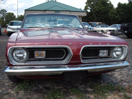 ORIGINAL MATCHING NUMBER & MINIMAL RUST CONDITION CAR SEEKER WANTED (in other words: don't compare this one with others in this Ebay market @ possible lower price; U get what you pay for; this car has 100,000 miles to go w/o restoring)! Original matching numbers 273 cubic inch V8. Automatic center console shift with bucket seats. *Factory air conditioning (& works). Power steering, brakes, & top. Dash tach(works). Everything works. Starts & runs decently needing usual basic tune up (plugs/wires mostly; electronic ignition added & seems to be correctly functioning). There is no oil burning smoke or overheating. The automatic transmission is working properly with no incorrect shifting sequences & has proper/expected band tightness (no slipping/clunking). To the best knowledge of the previous owner, it is the "original" odometer mileage (52,763). Her husband validated it when he purchased it & it looks it based upon minimal rust, pedals, original carpet/seats, etc. TWO car versions for the price of one. Version 1) *Top UP* & A/C., Version 2) *top down* cruise options.......................TWO variations; ONE price. *************See VIN door plate picture (factory fender tag picture available; codes posted later-I have to sand paper it to read better). The title is in my name-Florida.; clean; NO liens, NO rebuilts or salvage brandings. Last owners were senior citizens & had since 1997; always garaged. . All floor pans are original & NO rust, same with doors, inner rockers, inner quarters, inner wheel wells, frame, trunk & wheel well partitions. Minor rust on one 3 inch rocker area & 2 to 3 more 2 inch areas (pictures available). Some time scratches, maybe 2 dings. I used a weak magnet (weak magnet used on purpose so if it sticks, good indicator -good metal) on all areas that old car people know might have bondo. It clung to everywhere especially all door usual places. All fender wells solid; magnet tested everywhere. NO RUST in trunk (a trunk picture with the spare removed will be posted later, or I can send one at request). I think the painted burgandy color is the original color (code:N6W or NGW-correction pending fender code being sanded to claritify numbers/letters). The paint job looks like it could be buffed to shine nicely (with a motorized buffing procedure/professional). Rare, or at least preferred: buckets, center console auto shift, factory A/C ( *Note: aftermarket non-original add-on A/C costs about $2000+parts & labor; you hope installers do it right without messing something else up under the dash; any classic car or truck is always worth more with factory air, even if it is not working; so actually this cuda is only costing $13k for ownership, then add factory A/C value of $3k+; $16k car for only $15k-that price is FIRM as in "F-I-R-M" ). The seats & over-all interior is very well preserved including the dash. No cracks in steering wheel or dash pad. Driver's bucket has a small (1inch) seperation at the top corner, so the owner bought new front seats recover kit (new-in box). No need to recover anytime soon- see the pictures. Top material in great shape (no holes) with a glass window. The power top works flawlessly, although the original toggle switch is a bit finicky. The top boot is like new & all snaps are good. All the glass is perfect with slight factory tinting. Call: 904-881-3495. MANY pictures available. Request trunk, more floor (in & under), etcetera to be sent via emails. Only need apply if you want a CONVERTIBLE. AS IS SALE, as usual; even though low miles it is 46 years old..