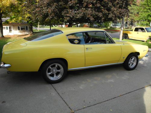 For sale is a 1967 Plymouth Barracuda Formula S. It has been repainted within the last 10 years to Lemon Twist Yellow, the interior is in excellent condition and is black. The motor was done by Muscle Motors in Lansing, MI and is a 340 stroked to 416ci. It is estimated to put out 500-550HP. There is less than 500 miles on the rebuilt motor. It has a 4 bbl Demon carb, Aluminum Edelbrock heads, long tube headers, Flowmaster exhaust and pulls very strong. The transmission is a Hemi 4 speed with a Hurst shifter. The wheels are Torque Thrust II, 15" in the front and 16" in back with BFGoodrich Drag Radials. There is a small crack on each front fender lip on the inside from the tires being slightly too tall when the wheel is cranked to the side. My email is kbmadness@aol.com please contact me if you would like more info or more pictures. This is a video of the car my son made: Trades considered |