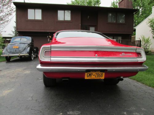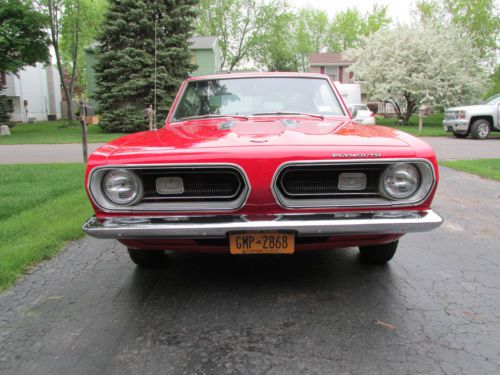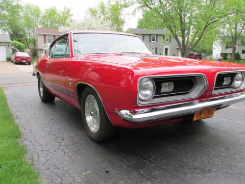 1968 PLYMOUTH BARRACUDA: MOTOR: 340 CUBIC INCH VERY HEALTHY AND SOUNDS AMAZING. I AM NOT THE BUILDER SO I DON'T HAVE ALL THE TECH INFO SORRY. WHAT I CAN SAY IS IT DOES NOT SMOKE OR MAKE ANY NOISE OTHER THAN A GREAT CAM SOUND. I HAD THE CARB REBUILT AS OF RECENT. SEE THE VIDEO: I DO A SLOW SHOT OF THE MOTOR SO YOU CAN SEE IN DETAIL. THE ENGINE BAY IS VERY SOUND AND CLEAN. PAINTED TO MATCH CAR. SEE PICTURES. TRANS: THE TRANS IS A 727 AUTOMATIC WITH A 3500 STALL. WILL SIT YOU DOWN IF YOUR FOOT IS HEAVY AND DRIVES NICE FOR SHORT CRUISES AROUND TOWN. REAR: THE REAR END IS A 8 AND 3/4 SET UP WITH 456 GEARS. SET UP LIKE A MOPAR SHOULD BE, IF YOU WANT A LONG HAUL CRUISER WILL NEED TO TONE IT DOWN. GREAT SET UP FOR LOCAL CRUISE NIGHTS. BODY: THE BODY IS REALLY NICE. DOORS OPEN CLOSE LIKE A NEW CAR. TRUNK AND HOOD THE SAME. NOT A BONDO BUGGY THIS CAR HAS A STRAIGHT AND CLEAN BODY WITH ONLY THE WEAR YOU WOULD EXPECT OF A DRIVER. CHROME IS NICE FOR A CAR OF IT'S AGE AND SHOWS WELL. FLOORS: THE TOURQUE BOXES AND FLOORS ARE SUPER. NO PATCHES OR REPAIRS. HAS WHAT SEEMS TO BE FACTORY UNDER COAT AND LOOKS GREAT. THE PINCH WELDS LOOK GREAT AND I SEE NO SIGNS OF ANY HITS OR WRECKS ANYWHERE ON THIS CAR. EXTRAS: I HAVE AND EXTRA SET OF RIMS STEEL WITH THE DOG DISH CAPS PAINTED TO MATCH THE CAR WITH TIRES. I HAVE AN ALL NEW EXHAUST WITH MUFFLERS AND ORIGINAL MANIFOLDS I HAVE A NEW MASTER CYLINDER AND A NEW GAS SENDING UNIT I HAVE A B&M HOLE SHOT CONVERTER 2200 STALL I HAVE THE ORIGINAL CARB AS WELL IF YOU CHOOSE TO TONE THE CAR DOWN ALL THE EXTRAS IS INCLUDED TO DO SO. THIS IS A TRUE DEAL YOU WON'T WANT TO PASS UP. I MAY NOT LIST IT AGAIN SO DON'T WAIT TO BID OR HOPE TO SEE IT AGAIN. LET YOUR SHIPPER KNOW ABOUT THE EXTRAS. ARE THERE ANY FAULTS: ONLY A COUPLE. THE FILLER NECK WAS REPLACED BUT STILL HAS A SLIGHT DRIP WHEN THE TANK FULL. IT IS THE GASKET AT THE SENDING UNIT. AS STATED ABOVE THERE IS A NEW ONE INCLUDED. SPEEDO BOUNCES TO BE EXPECTED FOR THE SET UP THE CAR CURRENTLY HAS. SMALL TEAR IN BACK OF HEADLINER NEAR BACK WINDOW AND ANOTHER ON BACK SEAT. BEST OF LUCK HAPPY BIDDING
