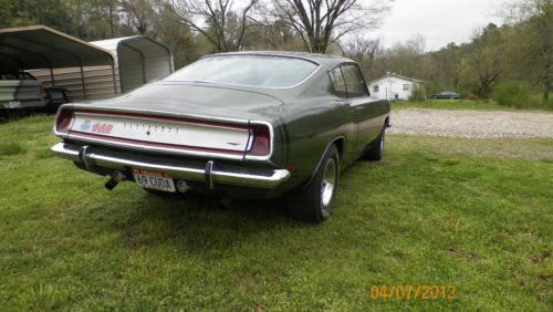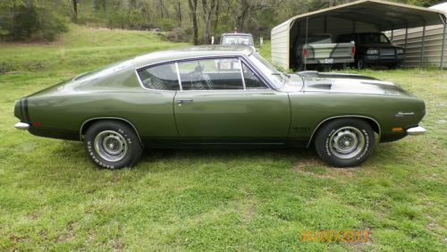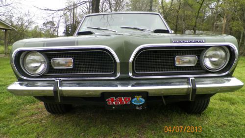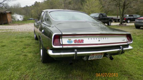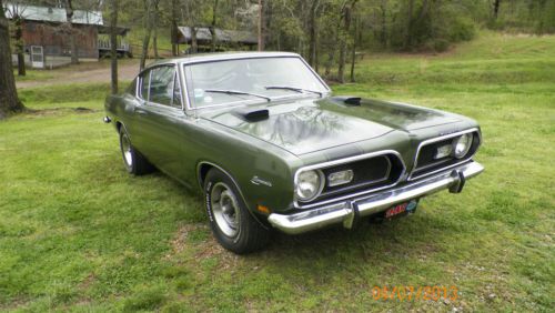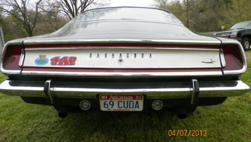 Up for sale is my fathers 1969 Plymouth Barracuda fastback. This car originally came out with a 383 motor and a totally decked out 440 was put in it at Mr. Norms Grand Spalding Dodge in Chicago in 1974. This care is beautiful and is WAY to fast. The car is all original except for the motor. The car has only 24,000 miles on it and the motor has less than that. It isn't even broke in yet. The interior is all original and is immaculate. It has had a paint job and it has a few specks and blemishes in some places. This is one rare car. If you have any questions feel free to contact my dad at 479-243-8138 or if you would like some pictures of something in particular on the car call me at 479-243-3683 |