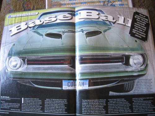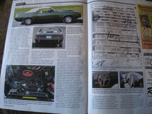 This car was featured in the October 2009 issue of Mopar Action magazine (see pictures). It was ordered with nearly every available option- cruise control, pwr. windows, pwr. steering, pwr. front disc brakes, handling package, AM 8-track, rally gauges w/tach., dual outside mirrors, 383 H.P., 727 torqueflite, rally wheels, luggage rack, front & rear elastomeric bumpers & I'm probably forgetting something. It is a very good driver/weekend show car that presents itself very well. The car originally had a black top & tan interior, also the 'cuda hood & chrome exhaust tips were added. I wouldn't hesitate to take it on a roadtrip. It has had a new trunk floor & rear 1/4'ers but the rest of the car is very solid. It has factory undercoating & is completely original underneath & very solid. Personal, prompt, enclosed delivery available. Thanks for looking & let me know if you have any questions. Paul 402-202-2263 |