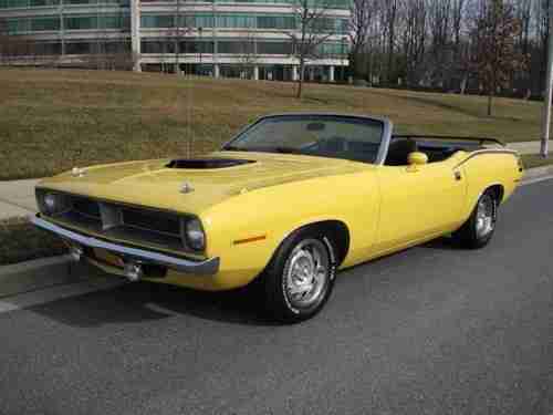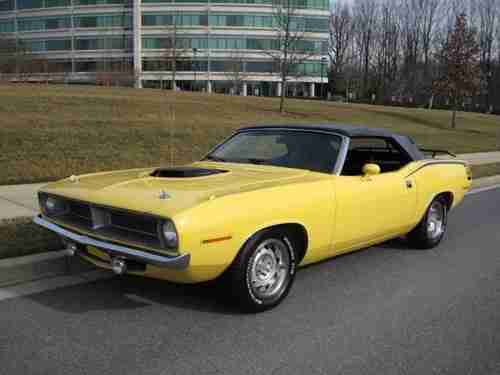 Original “V” code Cuda, 440-6bbl V-8 @ 390hp, original HD Torqueflite trans, 83/4 Sure Grip (posi) rear diff, correct coded mirror finish Lemon Twist yellow paint w/ black callouts, Shaker hood fresh air package, black bucket seat interior w/ factory console & pistol grip shifter, black power convertible top w/ matching boot, Rally dash w/ 8K tach + 150mph speedo, power disc brakes, fast ratio power steering, 15” Rally wheels w/ BFG radial T/A’s, great sounding dual exhaust w/ correct chrome bumper exit tips, all new chrome & polished stainless, beautifully restored, correct VIN, fender tag, restored and super rare.