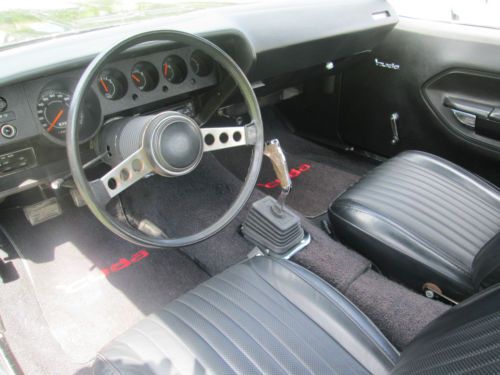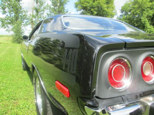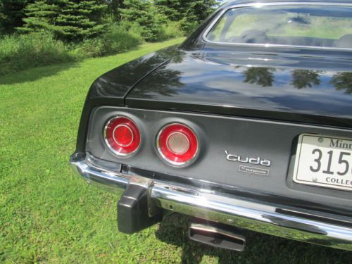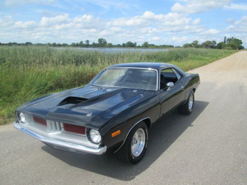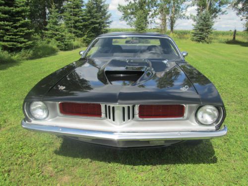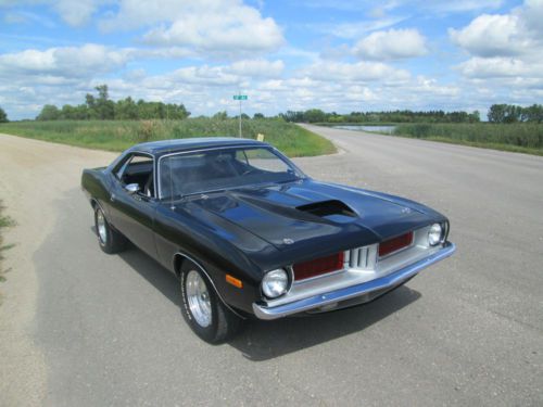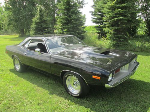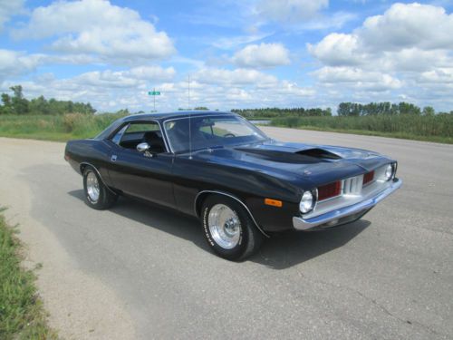 1974 PLYMOUTH CUDA LOTS OF MONEY INVESTED IN THE DRIVETRAIN ALONE! HAS A BUILT 440, BORED AND BALANCED, HAS A COMP CAM, DUAL FLEX-A-LITE ELECTRIC FANS, EDELBROCK PERFORMER RPM INTAKE, 750 HOLLEY DOUBLE PUMPER CARB, EDELBROCK PERFORMER RPM ALUMINUM HEADS, ACCEL 300+ RACE WIRES, FLAME THROWER COIL AND DISTRIBUTOR KIT, MOPAR BLACK WRINKLE VALVE COVERS, HIGH FLOW WATER PUMP, HEADMAN FULL LENGTH HEADERS WITH 3 INCH EXHAUST WITH CROSSOVER AND FLOW MASTER MUFFLERS. TRANNY IS A TREMEC 5 SPEED WITH THE FACTORY PISTOL GRIP SHIFTER ATTACHED, CAR IS A FACTORY STICK CAR. THE BELLHOUSING IS AN ALUMINUM KIESLER. THE REAR END IS AN 8 3/4 POSI WITH 3:91 GEARS. BATTERY IS LOCATED IN THE TRUNK, HAS A BRAND NEW GAS TANK, AIR SHOCKS. ALSO HAS DISC BRAKES ON THE FRONT. HAS NEW BFG TIRES, 235-60-15 FRONT AND REAR ARE 275-60-15. THE WHEELS ARE POLISHED CENTERLINES. THE CUDA HAS A FIBERGLASS LIFT OFF AAR HOOD! CAR RUNS COOL EVEN ON HOT DAYS, HAS GREAT OIL PRESSURE AFTER WARMED UP ABOUT 70 LBS. THIS CAR IS QUICK!!! AND DRAWS TONS OF ATTENTION! CARPET IS IN GREAT SHAPE, SEATS LOOK NEW! DOOR PANELS ARE GOOD AND ALSO HEADLINER. CAR IS STRAIGHT DOWN THE SIDES, THE FLOOR PAN, TRUNK, TORSION BAR MOUNT AND THE FRONT AND REAR FRAME RAILS ARE SOLID! ALSO HAS A FRONT SWAY BAR. ITS NOT PERFECT BUT A VERY NICE DRIVER!!! SHINY PAINT WITH THE 440 HOCKEY STRIPE IN FLAT BLACK. THIS IS A VERY QUICK AND RELIABLE CAR! NICE STREET MACHINE THAT CAN BE DRIVEN DAILY AND TURNS HEAD WHILE DOING SO! AGAIN LOTS OF MONEY IN THE DRIVETRAIN!!! ONLY REASON FOR SELLING IS JUST RECENTLY BOUGHT A DODGE CHALLENGER RALLEY THIS CAR IS ON HERE TO SELL SO PLEASE BE SERIOUS WHEN BIDDING AND FOLLOW THROUGH WITH PAYMENT IF RESERVE HAS BEEN MET. LOOK AT THE PICS TO SEE THE CONDITION OF THE CAR BEFORE BIDDING, IF SERIOUS ASK ANY ?'S YOU MAY HAVE AND ILL BE HAPPY TO HELP IN ANY WAY. THANKS FOR LOOKING AND GOOD LUCK
