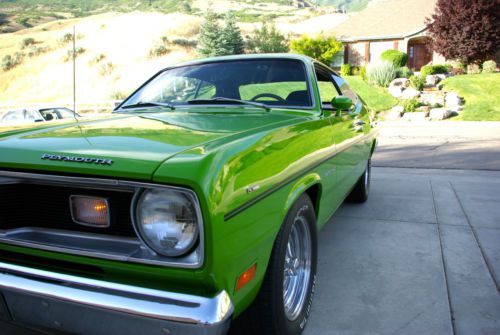 You get what you pay for in this life. Price is long forgotten after the quality is enjoyed year after year. This car wins "Best Of Show" everywhere It goes and it doesn't go in a trailer, it DRIVES THERE. This car is worth every dime I'm asking but I will entertain reasonable offers. Please don't send me nasty messages telling me that my price is NUTS or that I'm crazy. I know I'm asking top dollar for this car but this is a top dollar car and could NEVER be reproduced for less than 50K. If you think you can do it . . . . . good luck with that. This is a TRUE all numbers matching, absolutely pristine 1970 Plymouth Duster 340. It is stunning with no expense spared. This Duster 340 was built on June 12, 1970 (Friday) at the Las Angeles, California Plant. It is a factory undercoated car and consequently has no rust. It has been well preserved. It is very original and like I said before you will be hard pressed to find a better example. The car handles like new. It does not rattle, squeak, wander or make strange noises and it tracks perfectly straight going down the road. It is easy to drive, does not overheat and is blistering fast. Everything works including the radio. You can find videos of this car by searching “ Dave Mitton Duster 340 ” on YouTube. Here you will find videos of the final assembly for the heads. Intake was prepared by the same shop and port matched to the heads. Also, you will find a couple of walk around videos of the car and even a launch video of the car. Keep in mind that the launch video was shot in front of my house in Utah at an altitude of 5000 ft. The car performs much better at lower elevations. Also, that video was shot when the car had the stock 11” 1200 stall converter in it. I have been nice to the car. It has not been driven hard. It has never been to the track but with the right tires the car will easily go in the mid 12’s no problem. This car is real fun to drive. Fender Tag is Original to the car and decodes like this: E55-340 High Performance 4 Barrel Engine, D32-Heavy Duty 727 TorqueFlite Automatic Transmission, VS29-Duster Special Group 2 Door Hard Top, HOE-340 Engine 1970 Production Las Angeles, CA Plant, 149493-Sequence Number, FJ6-Sassy Grass Paint Color, L6X9-Low Grade Trim with Black Vinyl Bucket Seats, TX9-Black Painted Upper Door Frame, 612-Build Date of June 12th (Friday) 1970, M00634-Order Number, FJ6-Sassy Grass Painted Top, A62-Decour Package with Rally Dash, C16-Center Console, C55-Bucket Seats, G36-Left Hand Remote and Right Hand Manual Mirrors, M21-Roof Rail Drip Moldings, N41-Dual Exhaust, N95-Nox Exhaust Emission Control, R11-Music Master AM Radio, V6X-Black Longitude Sports Stripe, V8X-Black Transverse Rear Stripe, Y14-Sold Car, END-End Of Codes, 23-Line Inspector Stamp. The car does NOT have a build sheet please don’t ask me I do not have one. 340 Engine is original to this car Numbers Matching H Code. It was cast on Wednesday March 4th 1970 and has been freshly rebuilt bored .30 over for freshen up and still retains it’s original forged crank and factory rods. Real deal 340 HP engine here. Transmission is Numbers Matching and original to the car. It is a recently refreshed 727 Torque Flight Heavy Duty 3 Speed Automatic with a factory original console shifter. Rear End is the original 489 Sure Grip with a brand new set of 3:55 US Strange Gears. The carburetor is a Quick Fuel 650 but an Edelbrock 600 comes with the car if you want to put it back for the factory look. The Quick Fuel does wonders for this car. No kidding. Intake manifold is a hand ported and port matched Edelbrock RPM Performer. The factory original intake also comes with the car if you want to put it back. The radiator is the original 1970 340 Automatic with a date code of Thursday May 21, 1970. It has been absolutely and perfectly concourse restored by Glen-Ray Radiator and upgraded for maximum cooling capacity. It is absolutely breathtaking to look at and works even better than it looks. The car also retains it’s original fan and shroud. Heads are professionally ported polished and port matched Edelbrock Aluminum RPM Performer. Compression is 10:1 and the car comes with a set of vintage 340 heads if you want to put them back. They are “J” Heads not “X” Heads. Exhaust Manifolds are TTI Ceramic Coated Heat Barrier Treated Headers fed into a 2 1/2 Inch Complete TTI X Pipe exhaust and tips going through Turbo Flow Mufflers. The car also comes with it’s original HP 340 Exhaust Manifolds if you want to put em back. Stall Converter is a 10” 2800 Stall that works wonders for this car. The factory original 11” Converter and flex plate also come boxed up with the car if you want to put em back. Axles are original to the car small bolt pattern axles that have been upgraded to green sealed bearings. The original Tapered (Timken) Bearings also come with the car if you want to put em back. The left hand threads have been converted to right hand threads on the left side of the car. 1970 was the last year for left handed threads. All hoses and clamps including PVC, Heater, Radiator, Power Steering and Spark Plug Wires are date correct and concourse perfect for the manufacture date of the car. No detail was overlooked here. The engine bay on this Duster 340 is it’s best feature. Ignition has been upgraded to electronic including a new state of the art “Rev-N-Nator” box. This is a very nice upgrade that looks like a stock Mopar Orange Box, but gives you the added benefits of a rev limiter and an internal electronic flywheel that manages the timing curve perfectly keeping the initial advance at about 18 and total advance at about 36. Amazing product. Rally Dash is original. A tachometer was added and looks factory correct for the car but the original tachometers delete plate also comes with the car if you want to put it back. Steering wheel is currently a wood grain "Tuff Wheel" but the factory original 3 spoke A-Body only steering wheel is flawless a