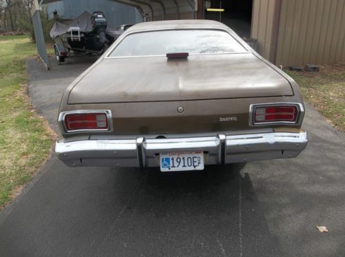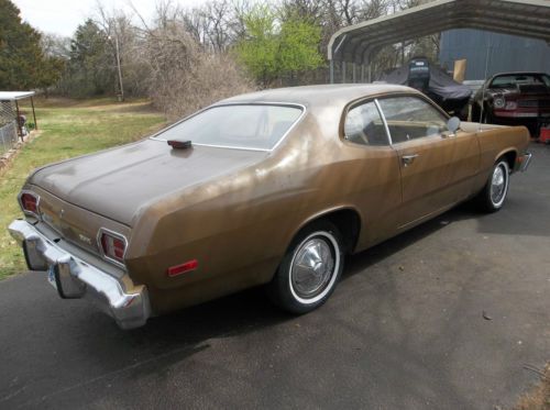 Barn find. 1975 duster. Base model. slant 6 auto. The car runs and drives well. I drove it 40 miles and back with no problems. Speedometer does not work along with dash lights. It needs a wiper motor and radio does not work. The car is rust free except the passenger floor had a couple of small holes that were patched with resin. There are a few hail dents more so in the rear deck lid. It needs carpet. The exterior of the car is rust free. Even the quarters are good. The interior needs attention. Please ask all questions. This car is a great start for a small block conversion. Please ask all questions. The car is from California. Has Cali plates, smog pump, and a third tail light. This is the nicest unmolested duster on the planet. Check out the photo's no rust. 1/4 panels perfect. This is a straight car ready for that 340/727 combo. What a sleeper it would be. |