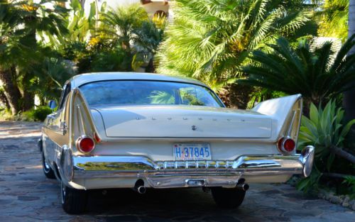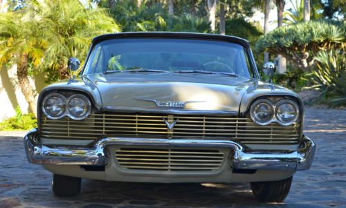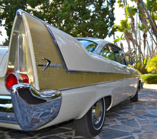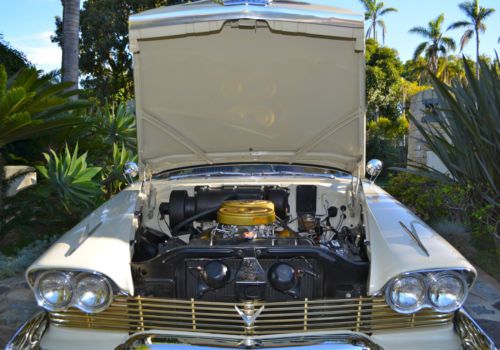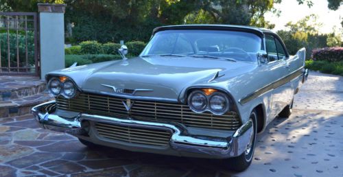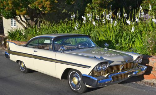 Here is an immaculate 1958 Plymouth Fury powered by the "Dual Fury V-800" engine, with dual-quad carburetors, 318 cubic-inches, and 290 horsepower It uses a push-button selector for the automatic transmission. These were Plymouth's top-of-the-line offerings for 1958, and the company called these their factory-built luxury hot-rods. There were only 5,300 of these built, and records indicate that only a small percentage of those still exist today. Each could be identified by the "Buckskin Beige" exterior color accented with anodized aluminum gold trim along the sides. These were only built for 3 years - 1956, '57, and '58 - making this among the last of the breed. This example was subjected to a "blank-check" restoration some 11 years ago by a professional shop. The process lasted three years, dictated by attention to detail and spare parts availability. The car was fully disassembled, the body was stripped to bare metal, and any damaged areas were repaired before being refinished in their original color. The chassis was stripped and repainted, with every corresponding system rebuilt/ renewed as necessary, including suspension, shocks, brakes, cooling, transmission, engine, low-restriction dual exhaust, etc. The interior was removed, the shell was repainted and fresh upholstery was installed, including carpet, dash covering, seats, door panels, headliner, soundproofing, and weatherstripping. All interior and exterior chrome was replated; new side trim was located and installed; and new Michelin radial tires and reproduction hubcaps were installed. Since the original drum brakes were considered marginal for a car this powerful, front disc brakes were added, along with a Sirius satellite radio system that works in conjunction with the original radio, augmented by a more powerful speaker in the dashboard and rear deck. Since its restoration - during which the car's odometer was reset to zero - this rare Fury has only been driven some 2600 miles, usually on its way to or from a car club event of some type, or just fun cruising on the local southern California back roads. When it's not on the road this Fury resides in a dry garage under a car cover. It has not been smoked in, and there are no peculiar odors or unusual things to report. It is simply a gorgeous example of a very rare automobile that runs and drives superbly. It has just had a full service, and it is being offered at a price far below its restoration cost.