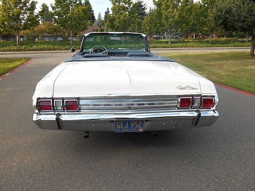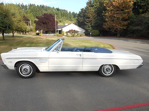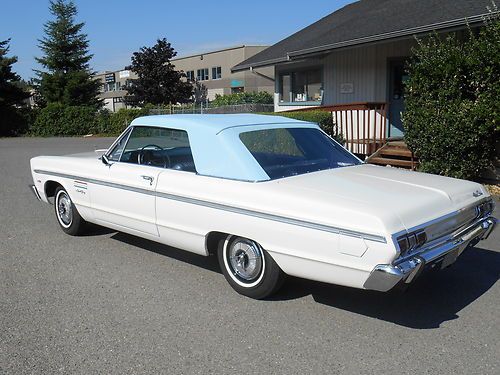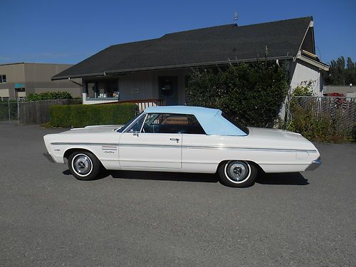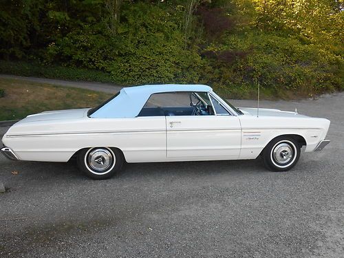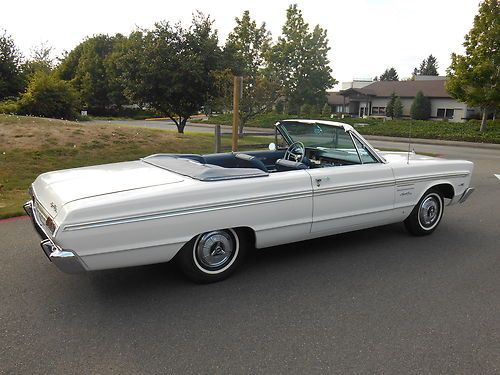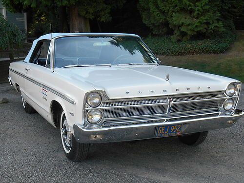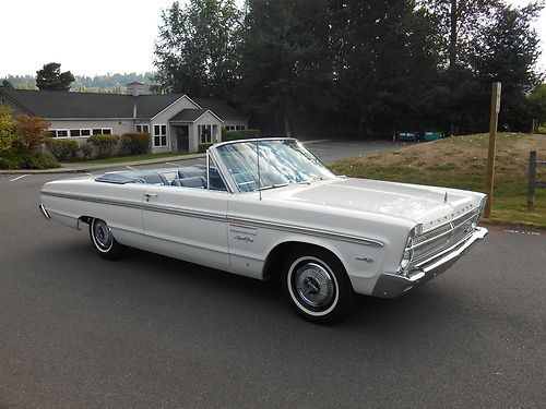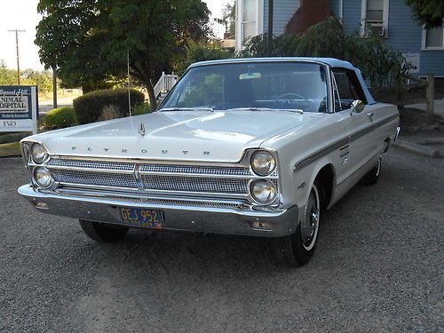 Selling an original 1965 Plymouth Sport Fury convertible factory Indy 500 Pace Car equipped with optional 383 4 barrel HP engine, dual exhaust, AT, PS, and PB. This car came factory white with blue conv. top and dark blue interior as all 65 Pace Cars were ordered that way. I found it in warm sunny dry Eastern Oregon and it is one of the most rust free cars you will ever find. It was parked in 1992 so I decided to restore the entire car. It has new paint, complete Legendary Auto interior, correct light blue conv. top (Pace Car only), re-chromed bumpers, new Goodyear Super Cushion 7.75-14 tires, and completely rebuilt drive-train. Original engine is fresh .030 over 9 to 1 compression all stock with correct afb carb, dual point dist. and air cleaner. Original radiator tested and rebuilt by best shop around, AAA Radiator in Redmond, WA. All gauges, lights, heater, turn signals work as they should and original Indianapolis 500 Pace Car dash plaque is intact. Top goes up and down perfect as new top cylinders were installed. Underside of car including frame rails, rockers, floor pan, lower quarters, and torsion bar anchors are very nice. There is no salt damage to this car anywhere. All chrome, side trim, and bright work shine nicely. Very nice driving and handling car even with the bias ply tires. Car has 11 inch brakes, front sway bar and 3.23 rear end. I found the original build sheet under the seat for the car and I have the fender skirts. Clear Oregon title. Any questions 619 929 8806. $500.00 non refundable deposit due within 24 hours end of auction. Car sold as is.